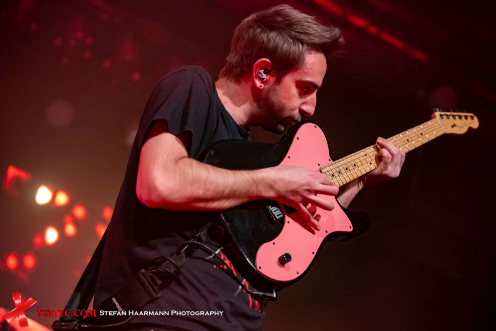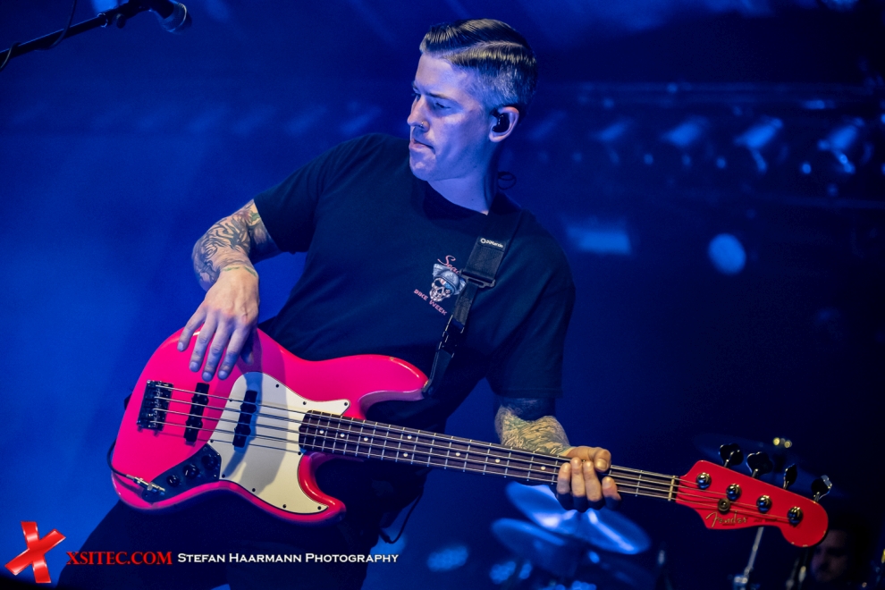 Als ALL TIME LOW im Anschluss die Bühne betreten, gibt es sprichwörtlich kein Halten mehr. Das Setting an diesem Abend wird dominiert von zwei LED-Leinwänden, die teils Farbimpulse, teils Livestreams des Konzerts zeigen. Frontmann Alex Gaskarth, mit Basecap und blauer Telecaster, zeigt sich von der vollen Hütte in Köln sichtlich angetan und agiert ähnlich energiegeladen wie Bassmann Zack Merrick, der gleich mal seine Sprungkraft demonstriert und trotz mächtigem Fender-Bass den „Flying Bassman“ gibt eine gefühlte Ewigkeit in der Luft steht. Gestartet wird der Abriss mit „PMA“, das 2021 zusammen mit der britischen Indie-Rock Band PALE WAVES eingespielt wurde, gefolgt von „Let It Roll“, sowie „Something´s Gotta Give“ vom 2015er Album „Future Hearts“.