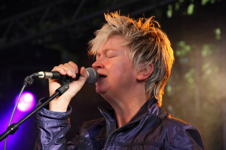 70 Minuten akustischen Ohrenschmaus gibt es dann mit ANNE CLARK auf der Hauptbühne. Die Grande Dame des Wave und ihre enorm talentierte Band intonieren die 16 Songs mit Cello, Piano, Gitarre, Keyboards und Drums äußerst gefühlvoll, rocken aber gleichzeitig mitunter ordentlich drauf los. Währenddessen steht Anne oft mit geschlossenen Augen am Mikrofon und lässt ihre Aura aufs Publikum ausstrahlen, das bei Hits wie "Our Darkness" und "Sleeper In Metropolis" ausgelassen tanzt. Ältere Songs wie "Abuse", "The Haunted Road", "Short Story" und "Echoes Remain Forever" wechseln sich mit aktuellen Stücke vom wunderbaren "The Smallest Acts Of Kindness"-Album ab und lassen den Auftritt zu einem Genuss werden. Als Headliner auf der Hauptbühne beglückt Steve Naghavi seine Krieger und Schlampen, wie auf den käuflich zu erwerbenden AND ONE-Shirts zu lesen ist und verbrät passend zu seinem Soldatenlook mit Deutschland-Fähnchen auf dem Arm gleich am Anfang die