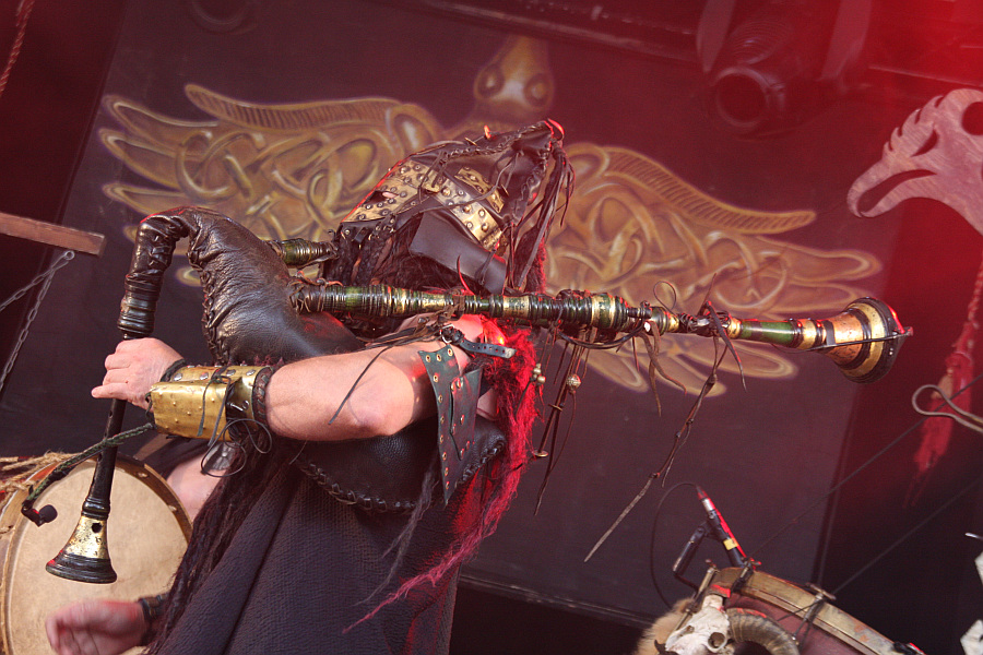 Corvus CoraxMächtig eng wird es auf der Bühne beim Auftritt von CORVUS CORAX. Die selbsternannten Könige der Spielleute haben nämlich nicht nur eine riesige Drehleier, die gleich von zwei Männern gespielt werden muss, sondern auch jede Menge Dekoration mitgebracht und sorgen so für ein prachtvolles Bühnenbild. Mit Maskenhelmen bekleidet und kräftigen Stößen in die Hörner verbreitet man zunächst eine düstere Stimmung, doch schon beim zweiten Song fallen die Masken und man kann den Spielleuten ins Gesicht sehen. Mit ihrem reinen Mittelaltersound sorgen CORVUS CORAX dann auch schnell für beste Stimmung im Publikum. Angetrieben vom dröhnenden Sound der gigantischen Trommeln auf der Bühne erklingen Dudelsäcke und Flöten, dazu der raue Gesang von Castus Rabensang und die mächtigen Hintergrundchöre. Zwar erreicht man nicht die Intensität der Shows im Rahmen der Cantus Buranus-Auftritte, doch auch an diesem Nachmittag lässt man sich von "Milli Anni Passi Sunt", "Venus Vina Musica" oder "In Taberna" gerne in mittelalterliche Spelunken entführen – zumindest in der Fantasie. Somit muss man CORVUS CORAX attestieren, das erste Highlight des Tages zu sein.