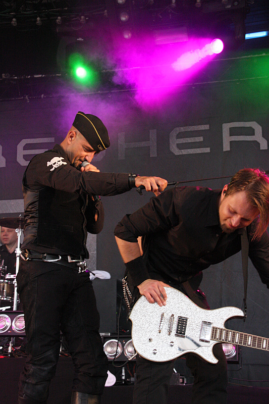 Auch wenn der Electro-Rock der süddeutschen Truppe alles andere als revolutionär ist, hat man doch zwei dicke Trümpfe im Ärmel. Zum einen nämlich jede Menge eingängiger Songs und Szenehits, mit denen man allein schon jedes Publikum für sich gewinnen kann. Und dann ist da natürlich noch Frontmann Alexx Wesselsky, dessen Name in jedem Lexikon unter dem Stichwort "Rampensau" zu finden sein sollte. Dank seiner unwiderstehlichen Mischung aus Publikumsnähe, Prolligkeit und Charme frisst ihm wirklich jedes Publikum aus der Hand, sei es beim metallischen Summer Breeze oder hier beim Amphi Festival. Klar, dass die Mitmusiker auf der Bühne da zu Statisten degradiert werden, auch wenn Gitarrist und Songschreiber Noel Pix immer mal wieder versucht, auch ein bisschen Rockstar zu sein, nur wirkt er dabei nicht mal ansatzweise so sympathisch wie sein Sänger. Der knutscht dann auch gerne mal Gitarrist Jürgen Plangger oder packt die Reitgerte aus, Eisbrechermit der er sich vom freudig im Fotograben rumhüpfenden Amphi-Dauergast Dr. Mark Benecke den Hintern versohlen lässt. Natürlich bekommen auch die anderen Musiker mal den Lederriemen zu spüren. Den ersten Teil der Show, in dem viele Songs des neuen Longplayers "Die Hölle muss warten" gespielt werden, lassen EISBRECHER aufzeichnen, danach erst lässt man die Stimmung mit "Schwarze Witwe", "Vergissmeinnicht", "Heilig", "This is deutsch" (natürlich mit Jodeleinlage und Seppelhut) und dem unvermeidlichen Klassiker "Miststück" richtig hochkochen. Dabei rennt Alexx mitten ins Publikum und hält den Besuchern das Mikrofon vor die Nase, zwischendrin wird auch mal FALCOs "Rock Me Amadeus" in den Song eingebaut. Immer wieder spannend auch, wie viele Frauen den Text von "Miststück" inbrünstig mitsingen – geht es dabei doch um eine bestimmte Spezies ihrer eigenen Gattung. Den Abschluss macht der eher lahme Titeltrack des neuen Albums. Trotzdem eine wie immer gelungene Show des Checkers und seiner Mannschaft, an der es kaum etwas auszusetzen gibt.