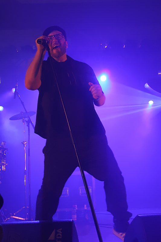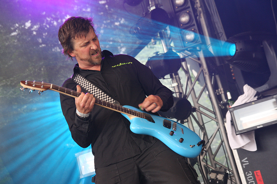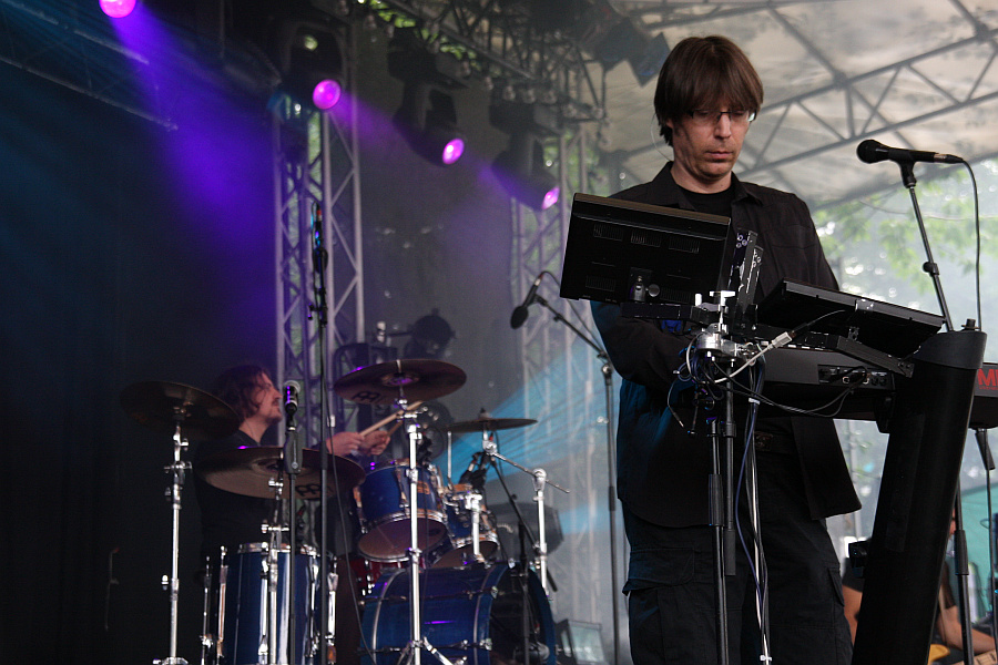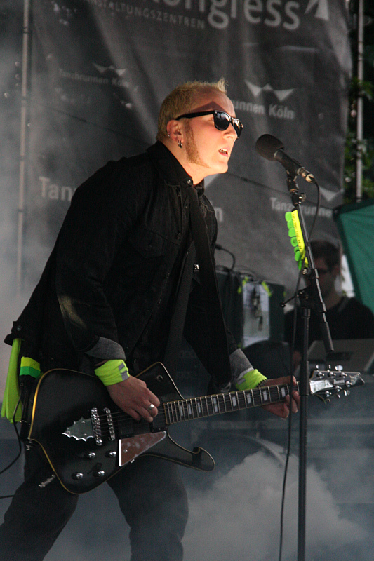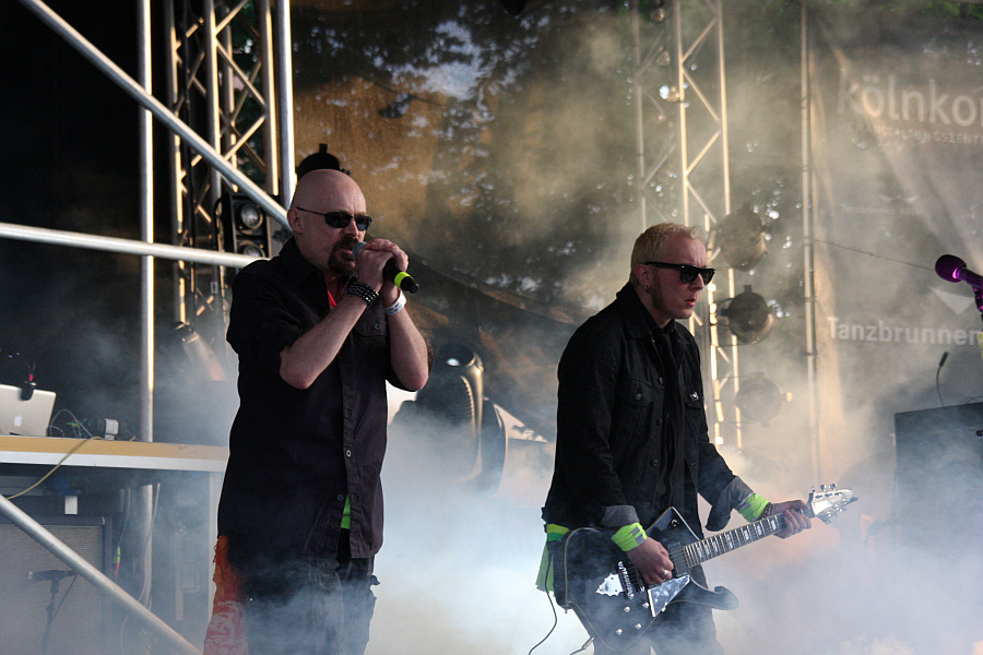 Die ersten Bands am Samstag heißen THE WARS, A-LIFE DIVIDED, EISENFUNK und TYSKE LUDDER – aus organisatorischen Gründen sind es jedoch die EBM-Klänge von SPETSNAZ, die ich als Erste im Rund des Tanzbrunnens vernehme und zum Clubhit "Apathy" sieht man bereits jede Menge Leute das Tanzbein schwingen. Mind.In.A.BoxAuf der Hauptbühne geht es danach mit MIND.IN.A.BOX weiter, was einigermaßen skurril wirkt. Eines der Trademarks der österreichischen Formation sind die verfremdeten Vocals und daraus ergibt sich ein seltsames Verhältnis aus akustischer und optischer Wahrnehmung. Sänger Stefan Poiss sieht nämlich aus wie ein freundlicher Lehrer (also schon recht bieder), wenn er jedoch anfängt zu singen, hört man zumeist eine modulierte Micky-Maus-Stimme. Eine sehr obskure Kombination. Das Instrument von Gitarrist Adam Wehsely-Swiczinskyin (der auch Produktdesigner ist) in seiner türkisen Bubbleoptik ist ebenfalls ein Hingucker. Durch den Einsatz von Gitarre, Bass und Schlagzeug wirkt der angenehm kühle Elektrosound der Band etwas rockiger und  basischer  als auf Platte und dafür kassieren MIND.IN.A.BOX dann auch ordentlich Applaus.
