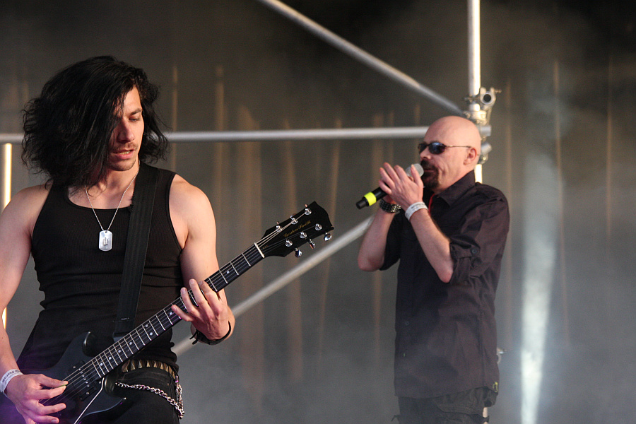 THE SISTERS OF MERCY stehen 2012 mit zwei Gitarristen auf der Bühne – allerdings sieht man keinen Bassisten, obwohl man die charakteristischen Bassläufe gerade bei den ganz alten Stücken deutlich hört. Die kommen dann eben aus dem Computer, was schade ist, ein echter Bassist würde dem ganzen wohl mehr Leben einhauchen. Zumindest die beiden Gitarristen sind so etwas wie Aktivposten und besonders Ben Christo sieht man den Spaß an der Sache an, während Chris Catalyst den coolen Rocker mimt. The Sisters Of MercyIm späteren Verlauf des Konzertes kommt zudem die irische Sängerin Lisa Cuthbert (kennt man von ANTIMATTER) auf die Bühne, um ein paar der Klassiker mitzusingen. Dass sie "This Corrosion" ganz allein und nur mit Pianobegleitung singt, polarisiert – der eine Teil des Publikums findet es großartig, der andere ist enttäuscht davon, dass der sonst gut abgehende Song in einer solchen Version gespielt wird. Zu diesem Zeitpunkt kann man aber auch schon von einem ordentlichen Auftritt der Sisters sprechen. Obwohl der Einstieg mit "Kiss The Carpet" gut gewählt ist, dauert es eine gute halbe Stunde, bis der schwache Funke von der Bühne aufs Publikum überspringt. "Crash And Burn", "Flood" und "Amphetamine Logic" folgen und erst ab "A Rock And A Hard Place" löst sich die spürbare Skepsis im Publikum und weicht langsam dem Schwelgen in wunderbaren Songs. Zwar gehört "We Are The Same, Susanne" nicht gerade zu den Klassikern der Band, wohl aber "First And Last And Always", "Alice", "Dominion/Mother Russia", "More" (leider nur in Kurzfassung), "Vision Thing", "Lucretia My Reflection" und natürlich das am Ende platzierte "Temple Of Love". Dank dieses wirklich guten zweiten Teils  wird man nicht Zeuge davon, wie sich eine Legende demontiert, sondern kann den Auftritt als ordentlich verbuchen.
