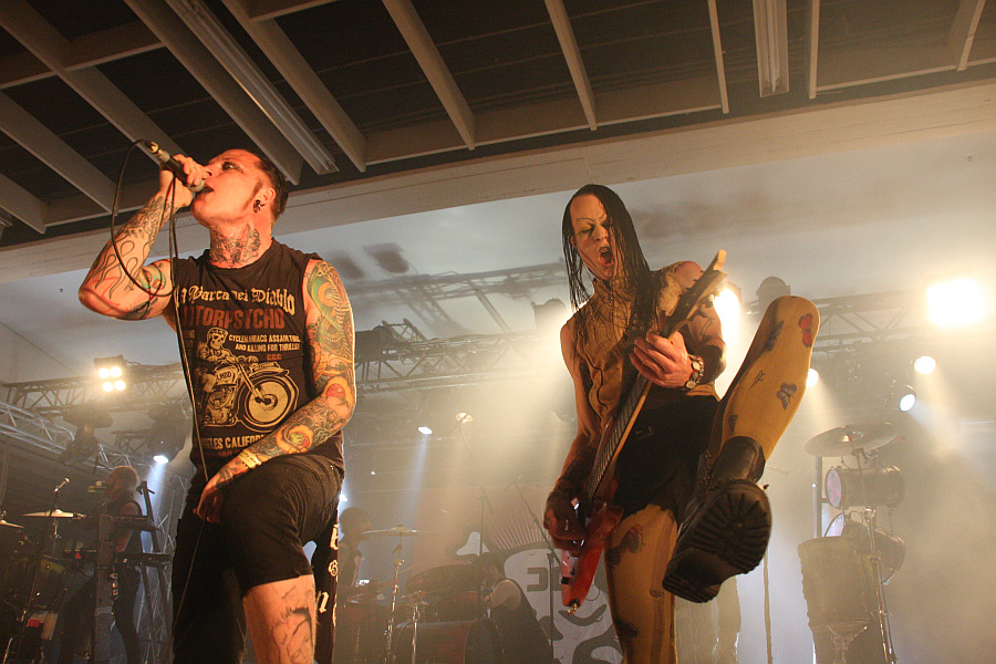 Und dann bricht das Chaos aus. Mit "What The Fuck Is Wrong With You?" starten COMBICHRIST ins Set und der Titel ist Programm - und offenbar vor allem auf sich selbst bezogen. Andy La Plegua kommt im Bärchen-Kostüm auf die Bühne, seine Keyboarder als Tiger und Pinguin. Der Drum-Irre Joe Letz schnappt sich erstmal eine Trommel und springt in den Fotograben, um die Trommel vom Publikum halten zu lassen und darauf herumzukloppen. Danach geht es wieder auf die Bühne, wo ein munteres Trommelwerfen los geht. Wie die Wahnsinnigen springen COMBICHRIST über die Bühne, jeder brüllt mal ins Mikrofon - was für ein herrliches, adrenalingeschwängertes Chaos. Nachdem der Song verklungen ist, bauen die Roadies die Bühne erst einmal so schnell es geht wieder zusammen, was sich aber als vergebliche Liebesmüh erweist.