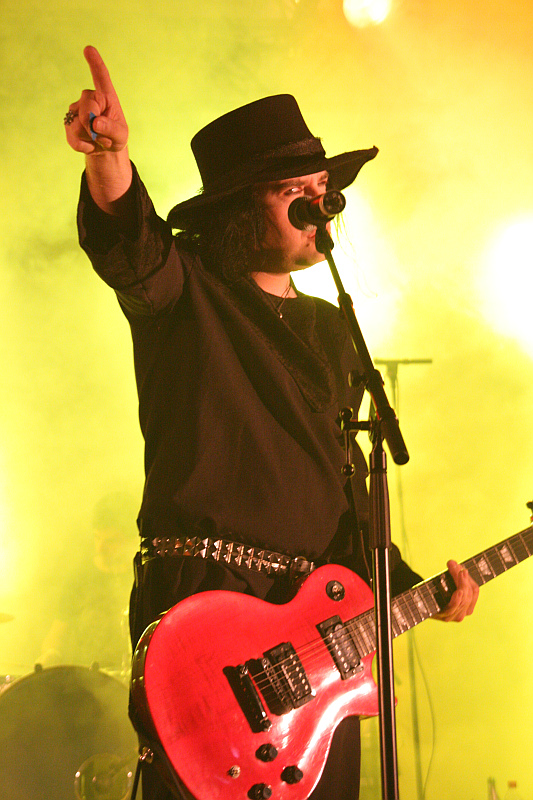 Im Staatenhaus ist es zunächst erschreckend leer, als WHISPERS IN THE SHADOW in ihr Set starten. Offenbar sind nicht allzu viele Besucher mit der österreichischen Band, die schon sieben Alben veröffentlicht hat, vertraut. Frontmann Ashley Dayour kommt mit Huf auf die mitunter grell beleuchtete Bühne und begleitet die Songs mit ausdrucksstarker Mimik und Gestik. Auch die anderen Musiker an Bass und Gitarre sind sehr agil und legen sich ins Zeug, der recht harte, gleichzeitig atmosphärische Gothic Rock ist jedoch für das müde Publikum eher schwer verdaulich. Dementsprechend begrüßt der Sänger die Zuschauer lakonisch zur "breakfast show", die aus acht Songs besteht. Letztlich kann man der Band jedoch keinen Vorwurf machen, denn der Auftritt ist insgesamt recht gelungen, auch wenn das Songmaterial ein bisschen Unverkennbarkeit vermissen lässt.