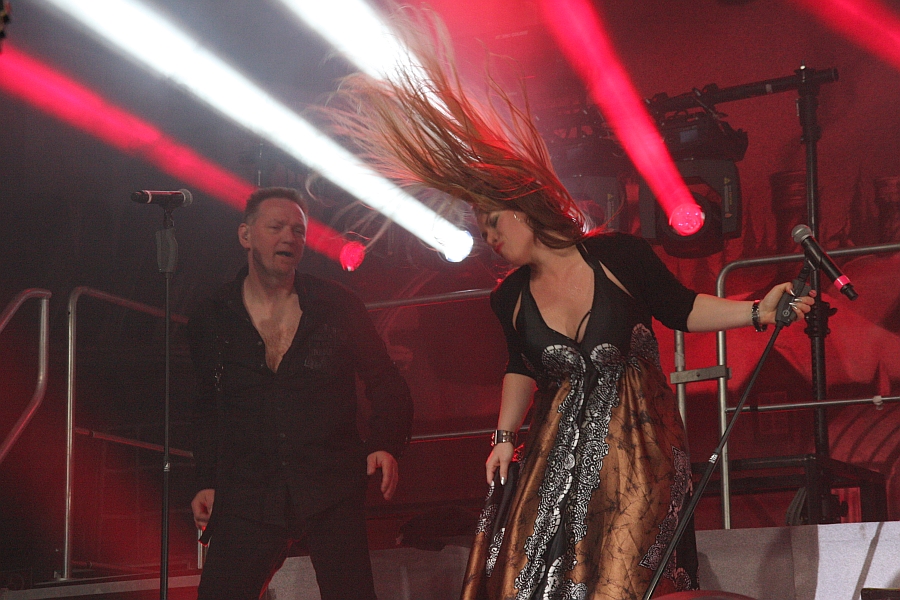 Dass Oliver Hartmann ein großartiger Sänger ist, hat der ehemalige AT-VANCE-Frontmann nicht nur auf den diversen AVANTASIA-Alben bewiesen; auf der Tour zeigt sich der zurückhaltende Sympath auch als versierter Gitarrist. Bei "Stargazers" darf Hartmann dann aber endlich nicht nur Backing Vocals beisteuern und die Sechssaitige bedienen, sondern als Hauptsänger auch im "echten" Rampenlicht stehen. Angesichts seiner Gesangsleistung kann man sich nur wundern, dass der Mann nicht als Hardrock-Superstar von Erfolg zu Erfolg eilt. Apropos "Backing Vocals": Für die sorgt in gewohnt souveräner und stimmlich wie optisch appetitlicher Manier Amanda Somerville; gemeinsam mit Sammet und Kiske, die auch „Stargazers“ veredeln, geht es mit "Farewell" wieder tempogedrosselt auf die rechte Autobahnspur. Große Melodien, mehrstimmiger Gesang, balladeske Stimmung – it’s time to raise the lighter. Was die gut 3000 Fans auch tun, Gänsehaut pur. Mit "Shelter From The Rain" (Sammet, Kiske, Catley) geht es dann wieder auf die Überholspur, insbesondere die Kiske-Parts dieses klassischen Melo-Highspeedsters sorgen mal wieder für offene Münder im Publikum. Das ruhige und unspektakuläre "In Quest For" ist vor allen Dingen als Pause für Drummer Felix Bohnke gedacht, der angesichts der Umstände in der Turbinenhalle – immer heißer, immer weniger Sauerstoff – ohnehin schon fast Unmenschliches leistet. Wer aber denkt, dass sich der Liederreigen jetzt schon dem Ende zuneigt, sieht sich getäuscht: Das epische und verschachtelte "The Wicked Symphony" mit Bob Catley und den nach vorne wandernden Backgroundsängern Rettke, Hartmann und Somerville zeigt, dass hier noch lange nicht Schluss ist – und dass die Jungs und Mädels auf der Bühne trotz der Hitze immer noch reichlich Spaß haben. (LH)