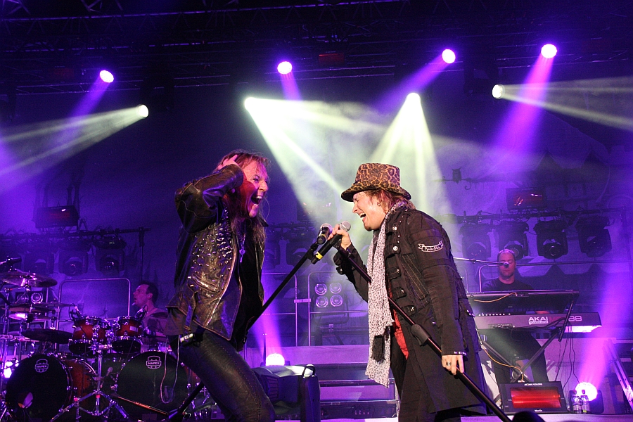 schüchtern, introvertiert, mit Textblatt in der Hand – der kann sich in Oberhausen nur verwundert die Augen reiben: Wie in alten Zeiten gibt Kiske nicht nur den gesanglich treffsicheren Vokalisten, sondern scherzt mit Tobi und dem Publikum, wirkt gelöst, mit sich und seiner Welt im Reinen. Ganz offensichtlich: Er hat wieder Spaß an der harten Musik und auf der Bühne. Auch beim anschließenden "Breaking Away", das tags zuvor aufgrund Kiskes Erkältung noch von der Setlist geflogen war, zieht der Glatzkopf gemeinsam mit Tobias Sammet wie gewohnt stimmlich vom Leder – in Oberhausen ist jedenfalls kaum noch etwas zu merken von irgendwelchen gesundheitsbedingten Einschränkungen. Mit "The Story Ain’t Over" zeigt sich erstmals MAGNUM-Sänger Bob Catley auf der Bühne, und auch wenn Catley auf der Bühne mit seinen komplett rhythmusbefreiten Gesten an Joe Cocker erinnert: Solche großen Melodien kann er perfekt singen; das Oberhausener Publikum zeigt sich auch beim gewollt kitschigen Song von der "Lost In Space"-EP äußerst textsicher. Das ein wenig langatmige "The Great Mystery" schlägt musikalisch in eine ähnlich Kerbe, nach den ruhigen Momenten ist es jetzt aber wieder an der Reihe, einige Gänge hochzuschalten. (LH)