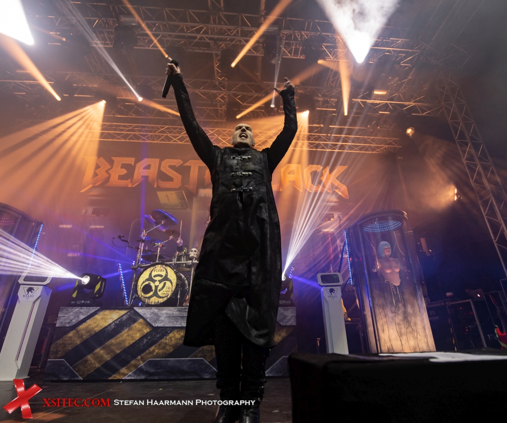 Der Umbau der Bühne danach ist etwas aufwändiger, da BEAST IN BLACK sich für ihre Tour eine Bühnendeko ausgedacht haben, in der zwei weibliche Cyborgs in gläsernen Litfass-Säulen das Schlagzeug-Podest Atte Palokangas´ flankieren. „Blade Runner“ vom aktuellen Album „Dark Connection“ eröffnet den Reigen der von Science-Fiction Serien und Comics inspirierten Titeln der Finnen, deren musikalischer Fokus eindeutig auf Spaß ausgerichtet ist. Somit ist eine BEAST IN BLACK Show immer eine ganz besondere Veranstaltung, die von der positiven Energie der Akteure lebt, deren Posings selten bierernst, meistens aber völlig überdreht und komisch zu nennen sind.