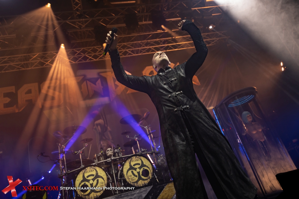 Allen voran sei hier Gitarrist Kasperi Heikkinen genannt, der auch schon einmal gerne in sein Spielgerät beißt, oder dem Publikum eine Auswahl seiner besten Grimassen bietet. Neben diesen Showeinlagen gibt es wie selbstverständlich tolle Musik, die Elemente des Power Metals mit poppigem Melodic Rock und Metal vereint und durch den einzigartigen Gesang Yannis Papadopoulos´ veredelt wird, der selbst in den aberwitzig hohen Registern seiner Stimme virtuos agiert. Aber BEAST IN BLACK können nicht nur laut: „Oceandeep“ vom zweiten Album „From Hell With Love“ verwandelt die Turbinenhalle in ein Lichtermeer aus Handytaschenlampen und bietet einen grandiosen Kontrast zur ansonsten dominierenden Ausrichtung der Band.