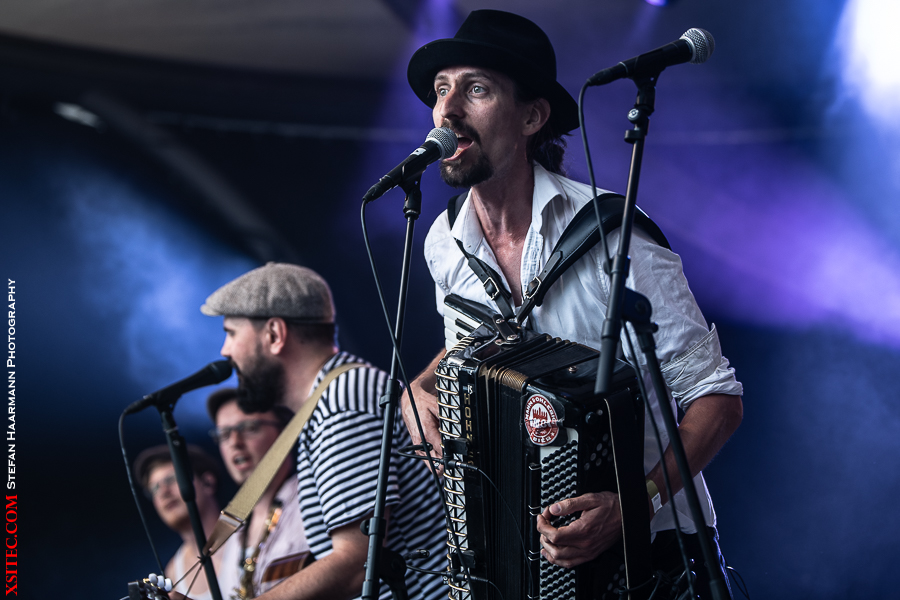 Bei meinem Eintreffen an der SPARKASSEN-Bühne wird dort schon heftig musiziert. THE HAPPY GANGSTAS, die als Partyband eigentlich einen späteren Slot verdient gehabt hätten, machen schon ordentlich Alarm und die zahlreichen Besucher feiern eine Swing-, Jazz-, Pop- und Punk- Sause, wie sie im Buche steht. Die Truppe gehört in Zukunft auf größere Bühnen.