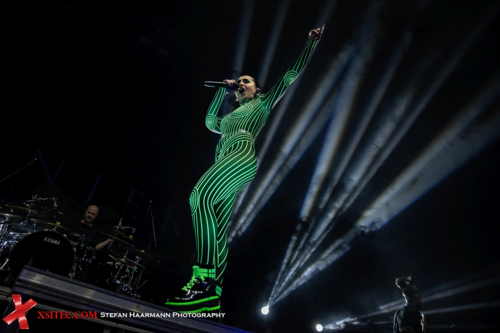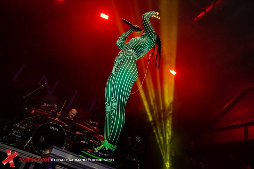Nach kurzem Umbau wird es zunächst komplett dunkel auf der Bühne. Sekunden später zeigt sich, warum das so ist. Frontlady Tatiana Shmailyuk hat sich an diesem Abend in einen hautengen Jumpsuit gekleidet, der im Schein der nun aufleuchtenden UV-Lampen grünlich phosphoreszierend einen tollen Effekt liefert. Das zieht natürlich die komplette Aufmerksamkeit des Publikums auf sich, was den Bandkollegen ein in diesem Falle sogar explizites Schattendasein verordnet. „Who´s Gonna Be The One“ fegt durch die Halle und neben den exquisiten Lichteffekten überzeugen die Schattenmänner Roman Ibramchalilow (Gitarre), Eugene Abdjuchanow (Bass) und Vladislav Ulassewytsch (Schlagzeug) an ihren Instrumenten und sorgen so für die Basis dieser grandiosen Show.