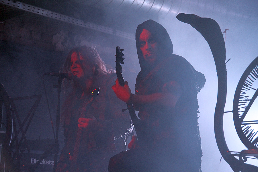 das politisch dem rechten Lager zuzuordnen ist. Tatsächlich aber besteht kein Grund, der Band entsprechende Tendenzen vorzuhalten und ein Label wie Season of Mist, bei dem das Duo inzwischen unter Vertrag steht, wird sich wohl kaum ein faules Ei ins Nest geholt haben. Nichtsdestotrotz gibt es immer noch Leute, die Vorbehalte gegenüber der Band haben. So auch der lokale Veranstalter der Tour in Wien, der möchte ein paar Tage später nicht, dass die Band dort auftritt. Innerhalb der Black-Metal-Szene genießen INQUISITION einen gewissen Kultstatus und so sind nicht wenige der Zuschauer gerade auch wegen dieser Band heute dabei. In musikalischer Hinsicht macht man im Black Metal von INQUISITION gewisse Parallelen zum Sound von IMMORTAL aus, was vor allem am ähnlich klingenen Gekrächz von Frontmann Dagon liegt. Der ist auch der einzige, der vor dem Schlagzeug zu sehen ist, denn auch live tritt man nur mit Gitarre und Schlagzeug auf. Trotzdem gelingt es, einen druckvollen Sound zu produzieren und so ist es recht beeindruckend, was die beiden da abziehen. Zudem ist Dagon ein Meister der großen Pose. Von der gewissen Eintönigkeit, die sich im Verlauf des Sets einstellt, lassen sich die Anhänger der Band natürlich nicht stören und haben Freude an einer ausgewogenen Setlist.