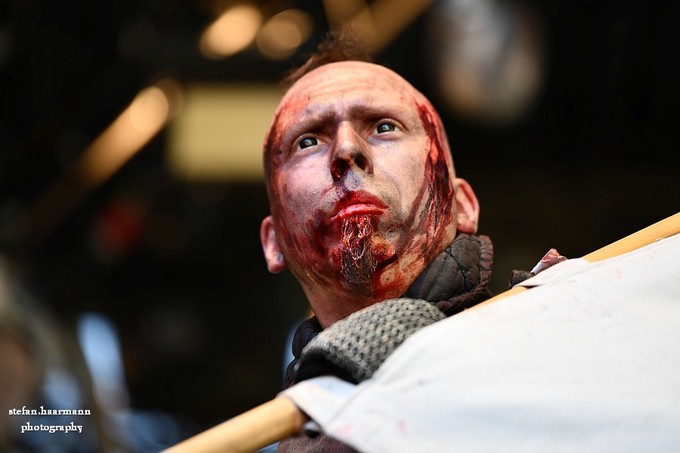 Nach den ersten drei Bands wird es martialisch. Vorhang auf für die Jungs von HEIMATÆRDE, deren Maskottchen ein grimmig dreinblickender, blutüberströmter Ritter ist, der wild mit einer Streitaxt fuchtelnd über die Bühne tapert. Etwas gewöhnungsbedürftig, wie ich finde.