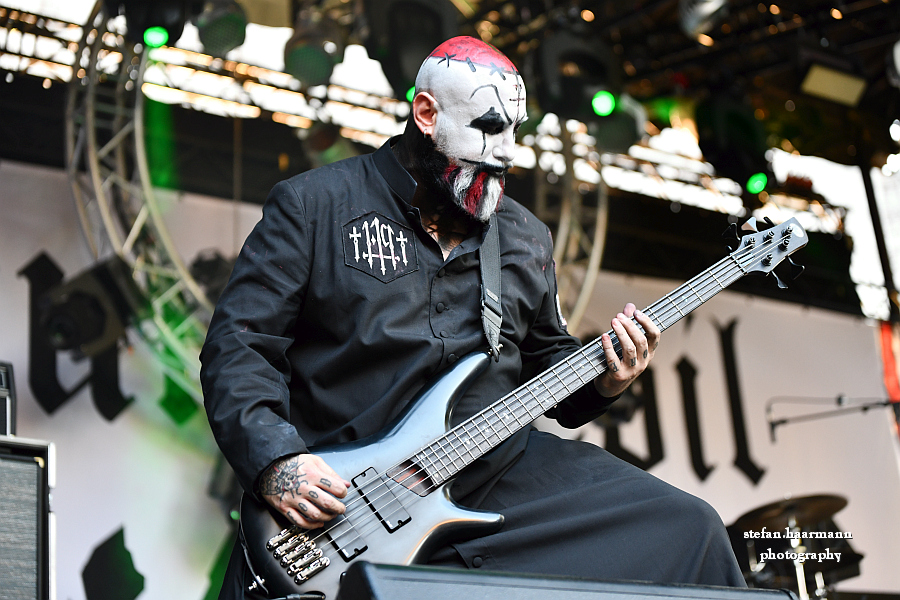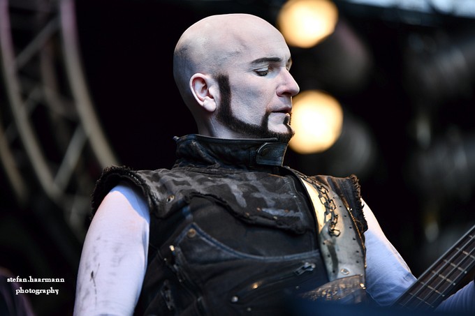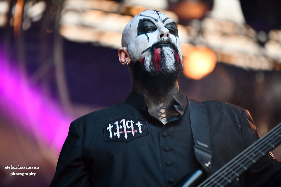 TANZWUT kommen, wie nicht anders zu erwarten, in gewohnter Manier geschminkt und angeführt von dem umgänglichsten TEUFEL, den ich kenne, auf die CASTLE ROCK Bühne. „Schreib es mit Blut“, der Titeltrack des letzten Albums, kracht so richtig aus der PA und stellt die Zeichen auf Vollgas.