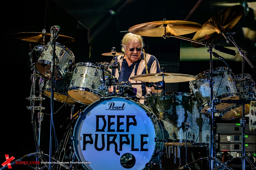 Somit ist alles perfekt angerichtet und nach kurzem Umbau stehen sie dann auf der Bühne: neben Ian Gillan (Gesang) greifen Ian Paice (Schlagzeug), Roger Glover (Bass), Don Airey (Keyboards), sowie der bereits erwähnte Neuzugang Simon McBride (Gitarre) zu den Instrumenten und legen nach „Mars, The Bringer Of War“ vom Band mit einer krachenden Version ihres Klassikers „Highway Star“ standesgemäß los. Auf der LED-Wall im Hintergrund gibt es zum Song passende Einspieler, die sich mit den von der Kamera am Bühnenrand eingefangenen Sequenzen der Hauptakteure abwechseln. Gleich darauf folgt mit „A Bit On The Side“ der erste Titel des seit Juli in den Läden stehenden, 23. Studioalbums der Briten, der bereits deutlich die Handschrift McBrides trägt, dessen Bandkollege Ian Paice ihn bereits vor seinem Einstieg bei DEEP PURPLE als einen der weltbesten Gitarristen bezeichnet hatte.