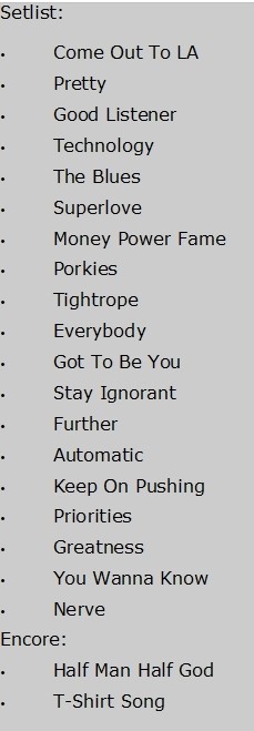 Wie zu erwarten war, brennt die Band ein Feuerwerk ihrer Hits aus mittlerweile 11 Jahren Bandgeschichte ab. Neben den Titeln des aktuellen Albums „Technology“, gibt es immer mal wieder Überraschungen in der Setlist, die sich im Aufbau und hinsichtlich der Songauswahl deutlich von der des Vorjahres unterscheidet. „Further“ vom „Automatic“-Album liefert einen Abstecher in deutlich poppigere Zeiten der Band, bevor mit „Greatness“ das Tempo wieder deutlich anzieht.