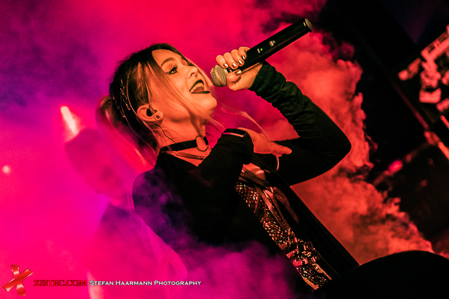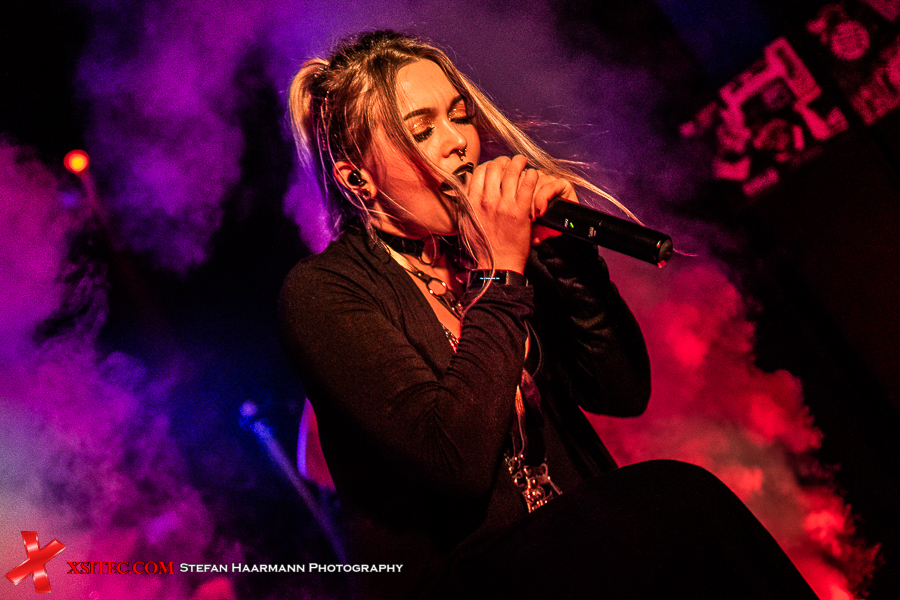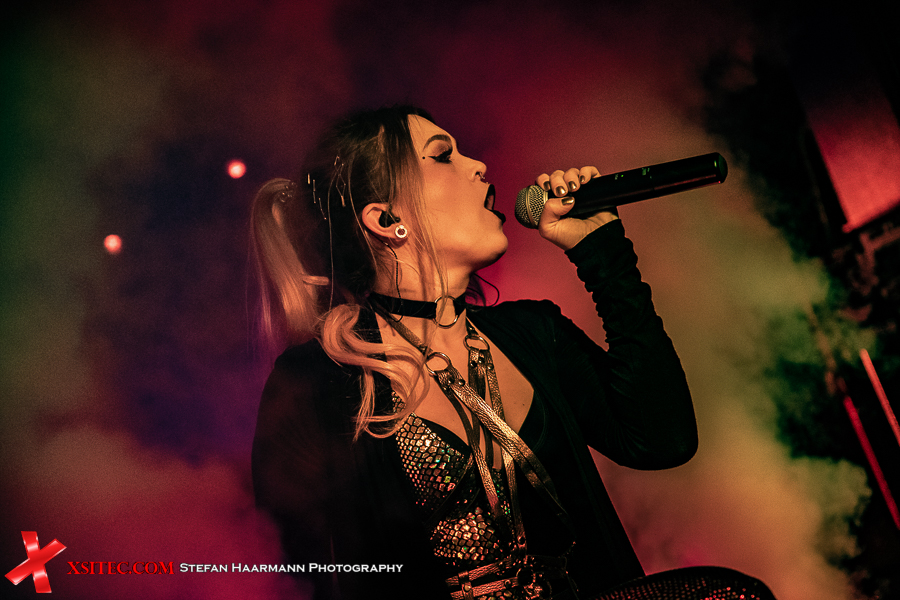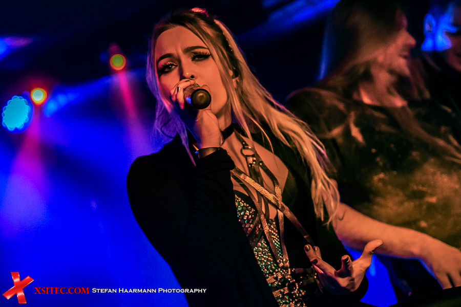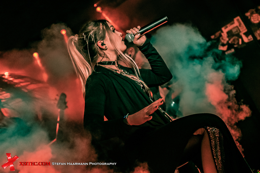Danach wird die Bühne für ENEMY INSIDE hergerichtet. Im Background werden diverse LED-Säulen aufgebaut, am Bühnenrand gehen die Nebelkanonen in Stellung. Nach dem Intro, zu dem die Bühne direkt einmal vollständig eingenebelt wird, betreten Nastassja Giulia (Gesang), Evan K (Lead-Gitarre), Dominik Stotzem (Bass), Dave Hadarik (Rhythmus-Gitarre) und Felix Keith (Schlagzeug) die Bühne und rocken mit „Falling Away“ direkt amtlich los. Das Strobo-Gewitter erzeugt in Verbindung mit den wabernden Nebelschwaden eine unwirklich-surreale Atmosphäre, der Sound ist brachial, aber differenziert und für die Location perfekt abgemischt. Chapeau!