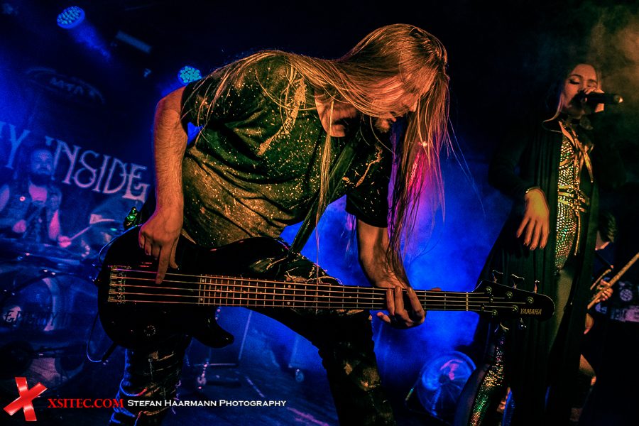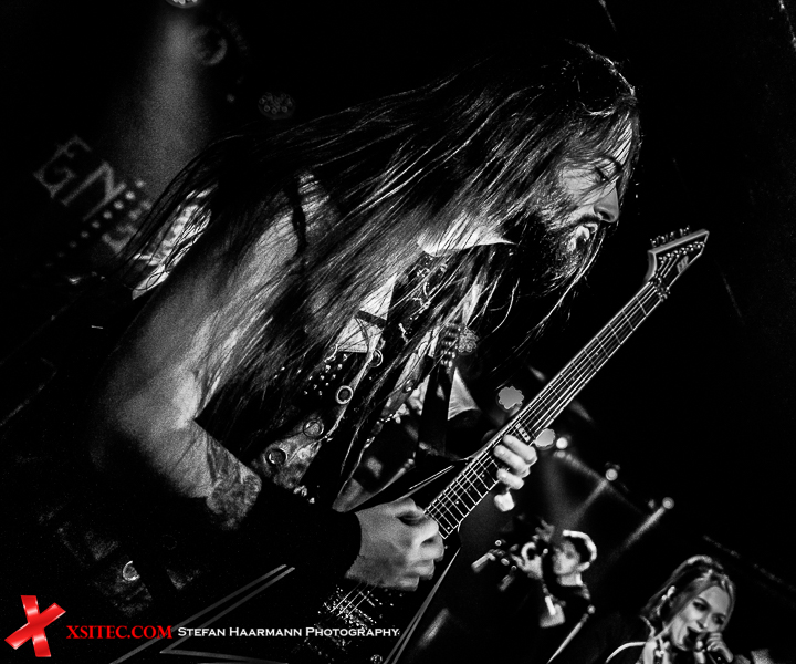 Nastassja Giulia würde in ihrem Outfit auch als Hollywood-Schönheit durchgehen, besticht aber so ganz nebenbei durch tollen Gesang und sympathische Bühnenpräsenz, mit der sie spielerisch das Publikum um den Finger wickelt. Links neben ihr bearbeitet Evan K den Sechsaiter mit enormer Vehemenz, während Basser Dominik Stotzem immer wieder seine Axt durch den Nebel schwingt und meiner Kamera die schönsten Grimassen zeigt. Weltklasse.