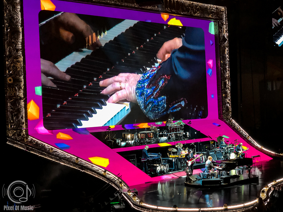 Pünktlich um 19:02 Uhr begann das von allen Besuchern heiß erwartete Konzert mit dem Song „Bennie and the Jets“. Der 72-jährige wirkte etwas gebrechlich und hatte sichtlich Probleme beim Laufen. Aber er war ja auch nicht für seine Sprinterqualitäten in Oberhausen, sondern als Musiker.