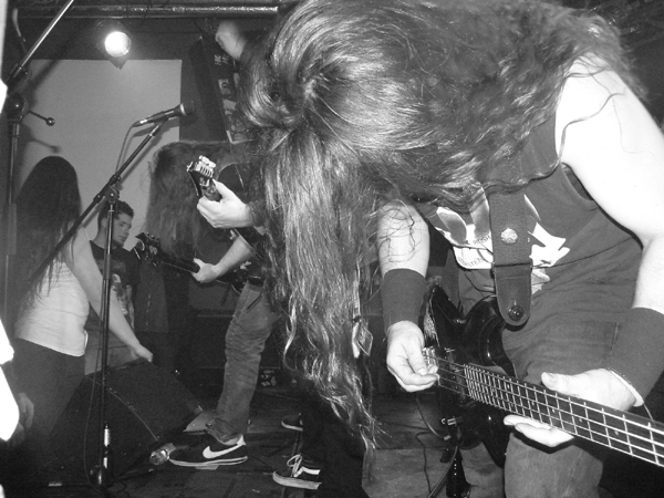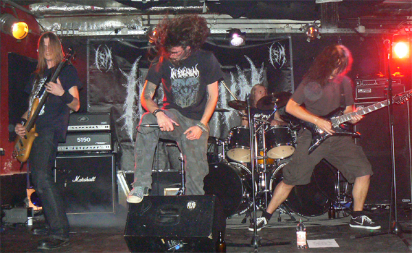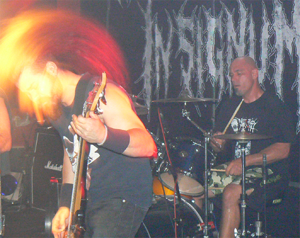 Dienstag Abend ist ein gutes Stichwort, das Hafenklang zum dankenswerterweise pünktlichen Beginn einigermaßen gefüllt, die obligatorische Lücke vor der Bühne beim Opener IN SIGNUM aber noch recht deutlich. Das Quartett aus Rotenburg/W. überrascht aber mit einer fetten Mischung aus Grind und Tech-Death, die bei aller Saitenraserei gut reinläuft und Spaß macht. Während der Bass-Mann recht unbeweglich dasteht, geht der Rest der Band gut ab, lässt sich aber leider durch einige Spaßvögel im Publikum mehr als einmal aus dem Konzept bringen. Dem Sänger ein Handy unter die Nase zu halten, auf dem „Der Gesang ist Scheiße“ steht, ist erstens nicht nett und zweitens unzutreffend. IN SIGNUM haben Potential und sollten unbeirrt ihren Weg gehen und vielleicht die lustigen Ansagen lassen. Brutalo-Musik und Witzchen gehen zumindest für mich nicht gut zusammen.