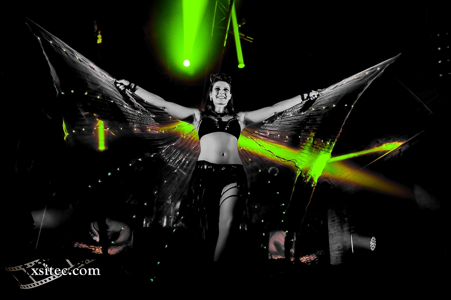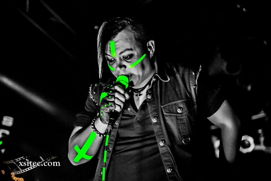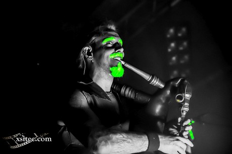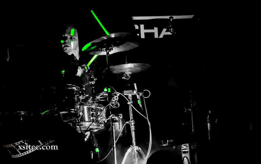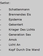 Als Support konnten die Senkrechtstarter von SCHATTENMANN gewonnen werden, die ich schon knapp zwei Monate zuvor in Oberhausen sehen konnte. Obwohl die landauf, landab grassierende Grippewelle auch vor Frontmann FRANK HERZIG nicht haltmachte, wird gekonnt aus allen UV-Kanonen gefeuert und die Szenerie des Öfteren in ein strahlendes Grün und Blau versetzt. Die Tracks des Debütalbums werden dabei mit starken, neuen Titeln gemischt, die schon einmal gehörig Lust auf den zweiten Longplayer der Schattenmänner machen, der nach Aussage Frank Herzigs bereits in Arbeit ist.