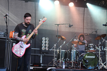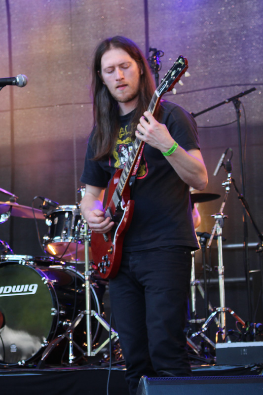 MOUNTAIN WITCH sind vor allem eins: sehr, sehr freundlich. Mit Hexenwerk hat ihr geradliniger Doom Rock dem äußeren Eindruck kaum etwas zu tun, scheinbar gebannt ist jedoch René Sitte an der Gitarre vom bereits großen Publikum und rührt sich kaum von der Stelle. Bassist Tobert Knopp fällt ebenfalls nicht durch übermäßigen Bewegungsdrang auf und lutscht dafür einen Lolli – Stoner Rock auf die sanfte Art halt, gleichwohl herzlich: ein aus Amerika angereister Fan wird persönlich gegrüßt. Wenn die Musik etwas Bergiges an sich hat, dann wohl von einem Hügel mit gut ausgebautem Wanderwegenetz im Sonnenschein: hier gibt es keine Abgründe, keine Gefahren, dafür schöne Landschaften und leichte Anstiege – Zeit für ein Frischgezapftes! Hut ab übrigens vor Schlagzeuger René Roggmann, der größtenteils den Gesang übernimmt und hinterm Drumkit ein eigene Munterkeit versprüht. Im vorderen Programmteil des Festivals ist das Trio somit gut aufgehoben und braucht sich musikalisch nicht zu verstecken, sondern darf ruhig mal an der Bühnenpräsenz schrauben.