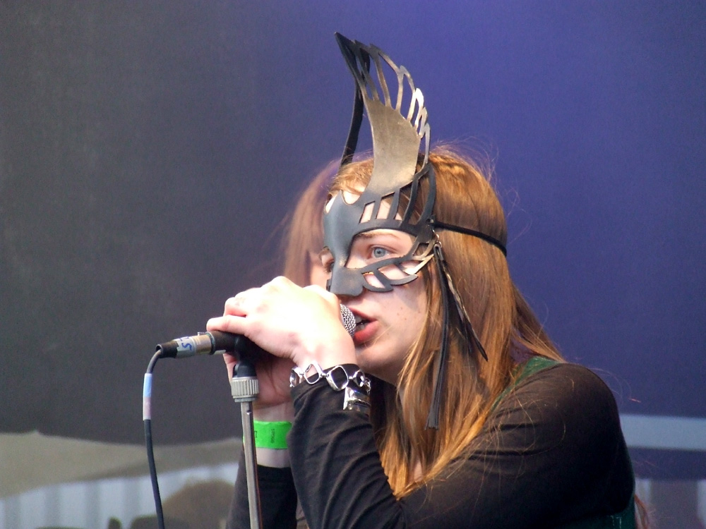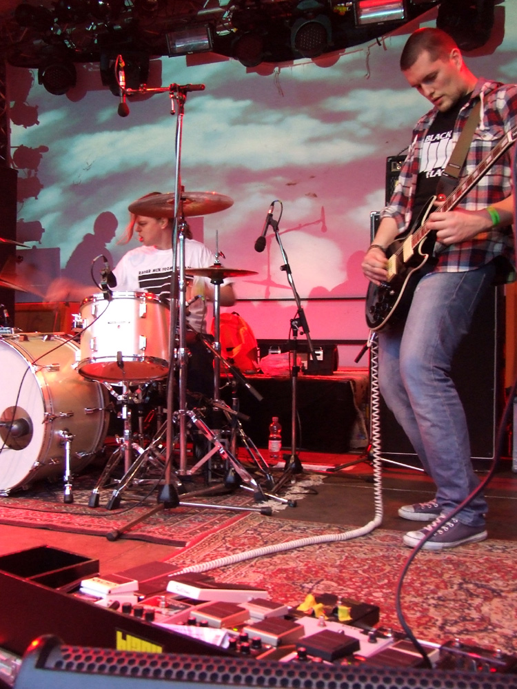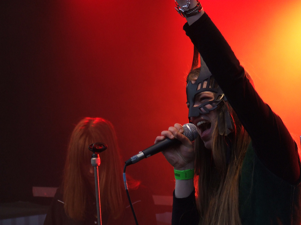 KATLA ist eine der Bands, wegen der ich angereist bin: Das extrem junge Quartett aus Stockholm hat nach einem raren Demo-Tape gerade seine erste Single veröffentlicht. Die Neugierde im Vorfeld wurde vor allem durch Videoclips von diversen Konzerten geweckt, unter anderem dem DunaJam 2011. Die Schweden erweitern das rockige Klangspektrum um Theremin wie Geige und strotzen vor Freude am Musizieren, gleichwohl ihnen die Festival-Atmosphäre anfangs Respekt abringt. Etwas schüchtern stehen die drei zunächst auf der Bühne (Drummer John sitzt natürlich), doch mit zunehmender Spieldauer verliert vor allem die wunderlich maskierte Lisa ihre Hemmungen: Die zierliche Dame erweist sich als Frontfrau mit ganz eigenen Manieren und trockenem Humor. Die musikalische Darbietung gerät wahrhaft psychedelisch und auf sympathische Weise verschroben, denn die Gruppe mäandert zwischen rockigen Stilrichtungen und anderen Klangwelten, ohne dabei ins allzu Gefällige abzudriften. Die beiden Namensvettern Nils an den Saiteninstrumenten legen sich nach einer Weile richtig ins Zeug, und der Gitarrist weiß anschließend nicht, ob es sich freuen oder traurig sein soll: „Das war das bislang größte Publikum, vor dem wir gespielt haben, und es hat so viele Spaß gemacht, dass ich die Bühne gar nicht mehr verlassen wollte…“ Auch der Rest der Band ist mit dem Gig zufrieden, den das Publikum mit deutlich mehr als nur Höflichkeitsapplaus bedenkt.