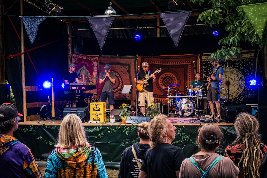 Ich kam an, nach einem kleinen Abenteuer, und wusste augenblicklich: die Entscheidung war richtig gewesen. Das Eingangstor zum Festival war handbemalt in echter mars-mushrooms-Manier; der Keyboarder der Band, Lars Weißbach begrüßte mich persönlich am Einlass; die Bühne war verantwortungsvoll-ökologisch in Schwersthandarbeit errichtet worden; fast alles war handgemacht, von den Pfand- und Frühstücksmarken bis hin zu den dekorativen Wimpeln, die von der Bühne hinüber zum selbsterrichteten Schutzdach angebracht waren.