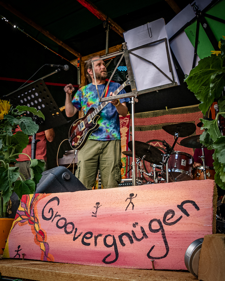 Mein Ersteindruck von den bis dahin völlig unbekannten Groovergnügen war das Conga-bestimmende Drumset, was Wärme und Sonnenschein, Ausstrahlung und Leuchten verhieß. Weil ich jedoch vermutete, mit meinen Kräften haushalten zu müssen, blieb ich weiter hinten und schaute Anderen zu, wie sie eingefangen und mitgerissen wurden vom Reggae-Blue-Grass-Jamband-Sound der Murnauer Band. Am meisten gefiel mir eine junge Mutter, die mit beiden Kindern – eins im Kinderkrippenalter und ein Baby – unterm Arm tanzte. Alle drei liebten es. Später, als ich zum drölften Mal zurückkam vom Zeltplatz, sah ich die gleichen Drei, diesmal in Begleitung des Flötisten und Saxofonisten von Groovergnügen – ich kam nicht umhin, ihm unbedingt zu sagen, wie es mich freute, dass es seine Drei sind.