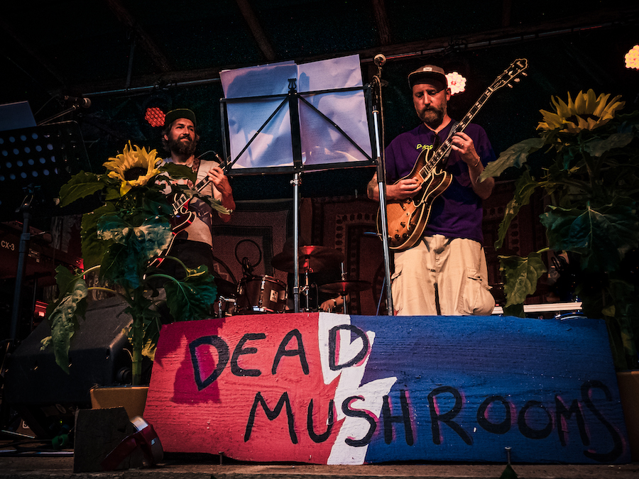 Und dann waren sie da, die Dead Mushrooms – beinahe ein mars-mushrooms-Paralleluniversum, mit zwei „Flügelmännern“ an zusätzlichem Drumset und Gitarre. Was Grateful Dead, deren Musik und Texte anbetraf, wandelte ich im Tal der Ahnungslosen. Einzig #Roseanne gab mir mit ihrer Fernsehserie und der Namensgebung ihres verspäteten jüngsten Sohnes, Jerry Garcia, einen Hinweis auf die Bedeutung der Band und ihren Einfluss. Dead Mushrooms liebevoller Tribut an Grateful Dead und Gerry Garcia war die perfektionierte Ein(An)leitung – ich hätte mir keine bessere wünschen können. Gibt es überhaupt eine? Das Publikum liebte jeden Takt, und wessen Lieblingslied drankam, bewegte sich zu seinem inneren Herzecho und verdeutlichte es somit zweifelsfrei. Als ob er zusah, stand ein respektvoll-dimensioniertes, zweifarbiges Gemälde von Jerry mit vorne am Bühnenrand, nahe dem handgemachten und -bemalten Holz-Bandschild der Dead Mushrooms. Noch einmal war mir so: Alles war richtig.