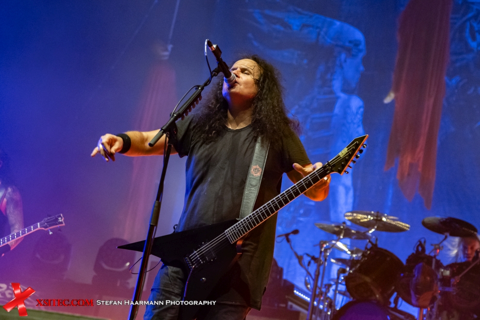 KREATOR starten ihr Heimspiel – wie könnte es anders sein – mit „Hate Über Alles“, würdig in Szene gesetzt durch mächtige Flammensäulen und vielstimmigen Background Chor des Essener Publikums. Mille Petrozza huscht ob des stimmigen Momentums ein Lächeln über das Gesicht, das nicht ganz zur ansonsten gepflegten Bösewicht-Attitüde passen will. Überhaupt geht es an diesem Abend selbst für KREATOR Verhältnisse ungemein aggressive zur Sache, die Motivation, in einer fast ausverkauften Grugahalle ein Heimspiel zelebrieren zu dürfen, verleiht der Band scheinbar Flügel.