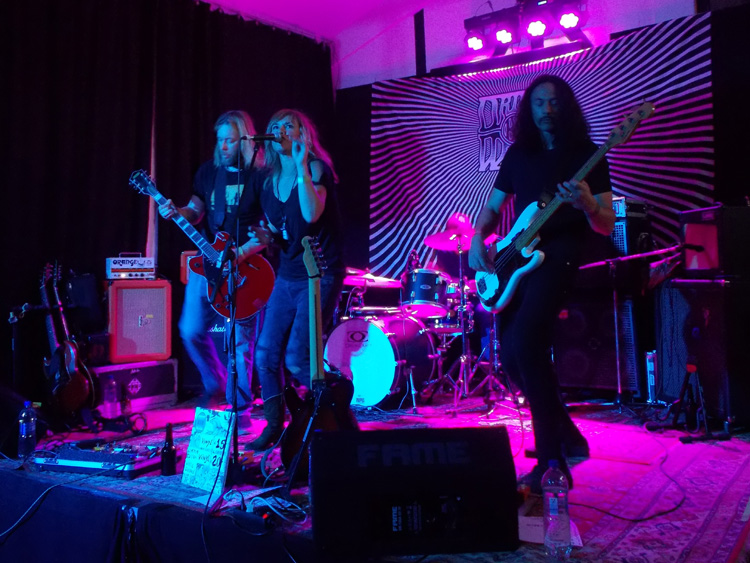 Bei der Stoner-Rock-Band DRIVE BY WIRE aus den Niederlanden steht mit Sängerin Simone Holsbeek die einzige Frau am heutigen Tage auf der Bühne, was die Musikerin selbst verwundert. Mit dem neuen Album "Spellbound" hat das Quartett einige kleine Hits im Gepäck, doch wollen diese nicht so zünden, wie sich das die Band erhofft. Der Bass knarzt ganz wunderbar, die Gitarre ist zu leise, Simone lässt sich trotz zwei überschaubaren Reihen von Zuhörern die gute Laune nicht verderben, und Alwin Wubben nutzt den Raum vor der Bühne für einen Ausflug mit seiner Gitarre. Seine Verwendung einer Kölsch-Flasche zum Sliden auf dem Griffbrett dürfte als eine bemerkenswert sinnvolle Verwendung dieser sonst fragwürdigen Erfindung in die Geschichte der Do(o)mstadt eingehen. Auch bei DRIVE BY WIRE behält die Spielfreude die Oberhand, gleichwohl bereits während des Gigs klar ist: Hier wäre mehr drin gewesen.