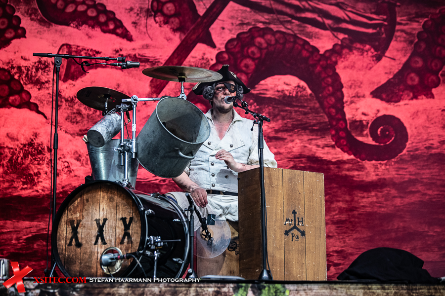 Nach kurzer Umbaupause, in der sich die Fans mit T-Shirts und Kaltgetränken eindecken, geht es mit MR. HURLEY & DIE PULVERAFFEN weiter. Die Party-Piraten spielen eigentlich fast an jedem Sommerwochenende im Rahmen der von Gisbert Hiller organisierten MPS-Tournee und sind daher besonders durch die infolge der COVID-19 Krise abgesagten Events betroffen. Umso frenetischer wird ihr Gang auf die Bühne hier in der Auto Arena gefeiert. In der ersten Reihe parkt ein Piratenbus, dessen Besatzung sich komplett in Piratenmontur geworfen hat, Augenklappen und aufgemalte Zahnlücken wie ihre Idole inklusive.