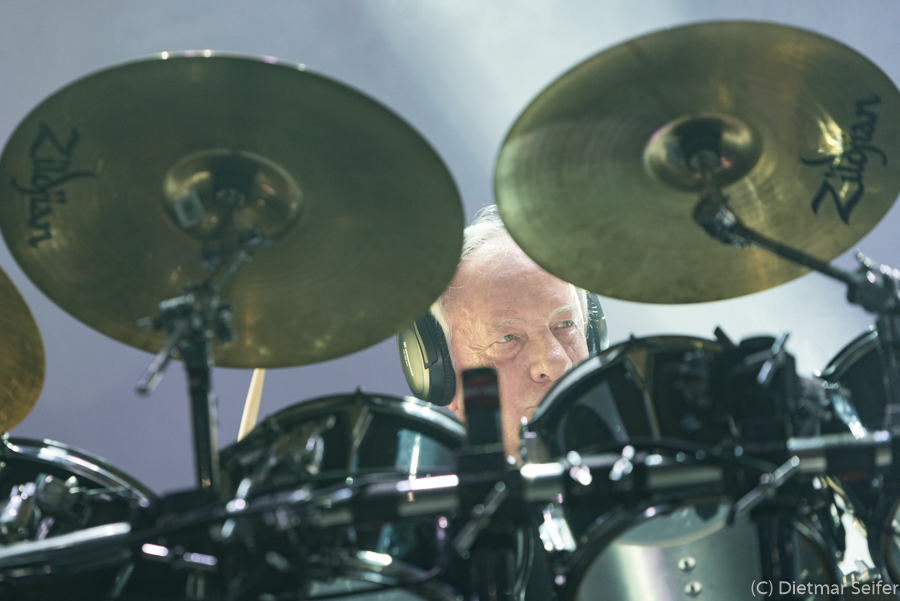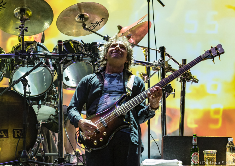 Ian Mosley saß so versteckt hinter seiner Schießbude, dass er zumindest aus dem Fotograben für mich kaum sichtbar war. Der Bassist Pete Trewavas stellt mich allerdings vor eine Herausforderung. Da er sein Spiel häufig durch stakkatoartige Körperbewegungen unterstützt, hieß es „Offenblende“ um möglichst kurze Belichtungszeiten zu erreichen.
