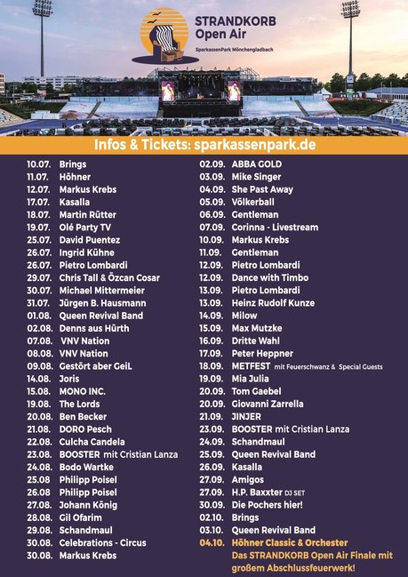 Der Festival-Sommer fällt in diesem Jahr aus den hinlänglich bekannten Gründen ins Wasser, dennoch gibt es Lichtblicke am Ende des Tunnels. Der SparkassenPark Mönchengladbach präsentiert eines der ersten, bundesweiten Konzepte zur Durchführung von Open-Air Veranstaltungen unter COVID-19 Bedingungen und bietet eine der wenigen Möglichkeiten, Veranstaltungen unter freiem Himmel mit knapp 1.000 Besuchern zu erleben.