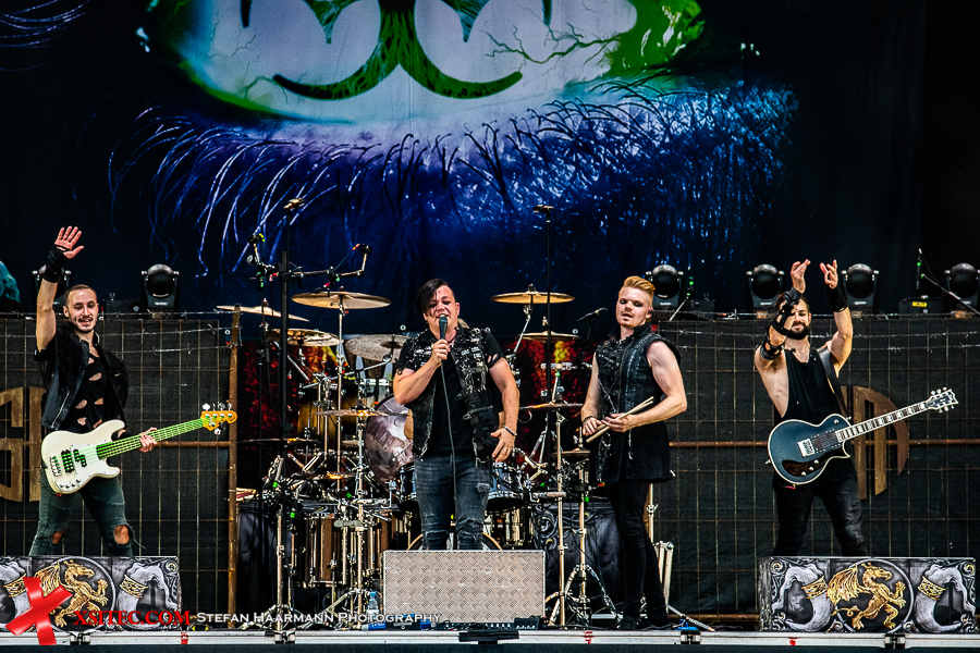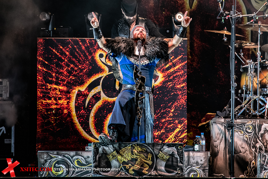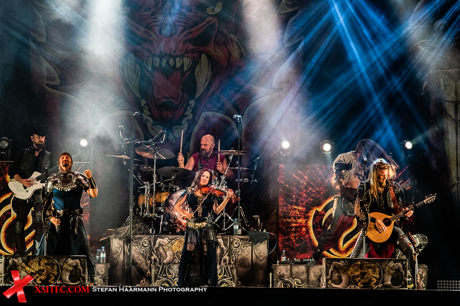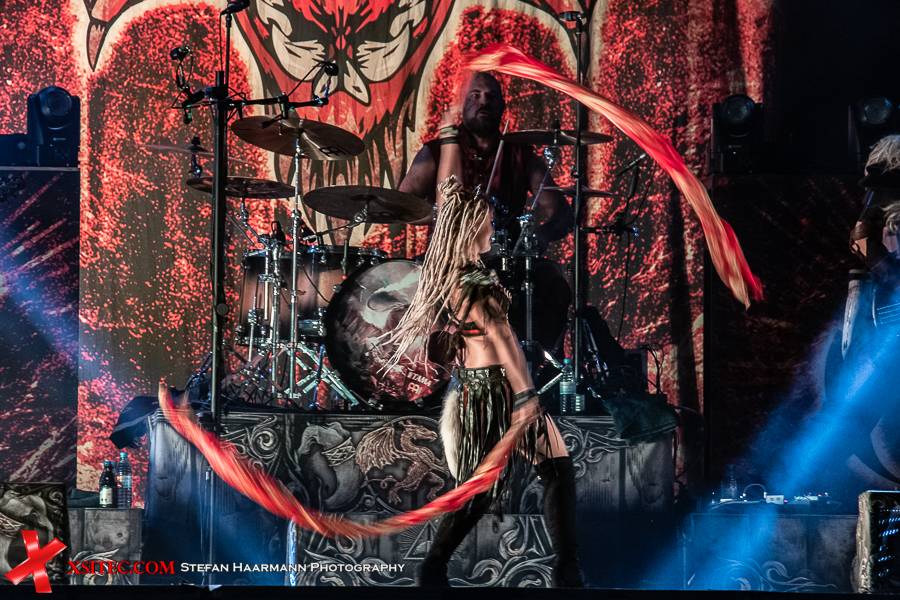 Für Tanzeinlagen und optische Highlights sorgt immer wieder die „Mieze“, die in wechselnden Kostümen den Rittern der Metrunde einheizt. „Schubsetanz“ vom 2018er Kracher „Methämmer“ wird vom Hauptmann und dem Prinzen selbstredend auch im Strandkorb abgefeiert, der extra zu diesem Zweck auf die Bühne gekarrt wird. „Prinzessin“, „Das Elfte Gebot“ und „Kampfzwerg“ heizen die Stimmung im weiten Rund weiter an, bevor mit „Ding“ die Coverversion des SEED Megahits ansteht, die in der Version der Feuerschwänze etwas metallischer, aber dennoch stimmig daherkommt. „Latte“ (Zitat Prinz R. Hodenherz III: „So richtig alte Scheiße“), „Operation Drachensturm“ sowie „Krieger des Mets“ beenden das reguläre Set, bevor FEUERSCHWANZ mit „Methämmer“, „Ketzerei“, „Malleus Maleficarum“ und „Unter dem Drachenbanner“ nochmals alle Register ihres Könnens ziehen