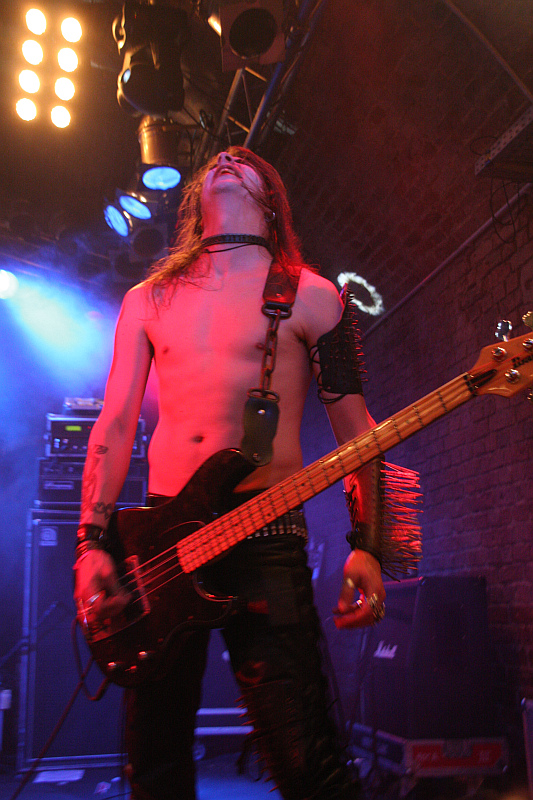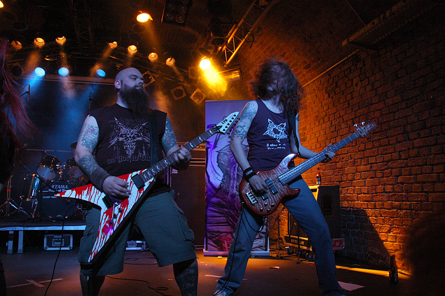 Im runden Gewölbe der Matrix wird es danach noch finsterer, als es eh schon ist. DESASTER entern in echtmetallischer Nieten- und Nägel-Montur und im Falle von Basser Odin auch mit Corpsepaint im Gesicht die Bühne, um dem Publikum eine Ladung angeschwärzten Thrash Metals um die Ohren zu hauen, die sich gewaschen hat. Mit Leidenschaft und Hingabe zelebriert das Quartett seinen finsteren, authentischen Sound und erntet völlig zurecht die bisher besten Reaktionen des Publikums. Besonders die Ausstrahlung von Sänger Sataniac, der seine Texte mit grimmigen Blick bellt, sorgt für boshafte Atmosphäre, aber auch Odin und Gitarrist Infernal sorgen mit sehenswertem Stageacting für das Gelingen der Show. Einziger Wermutstropfen aus Sicht des Rezensenten: da in Sachen DESASTER noch eine dringend zu stopfende Bildungslücke vorhanden ist, wird von den gespielten Songs lediglich "Teutonic Steel" erkannt. Trotzdem eine geile Show.