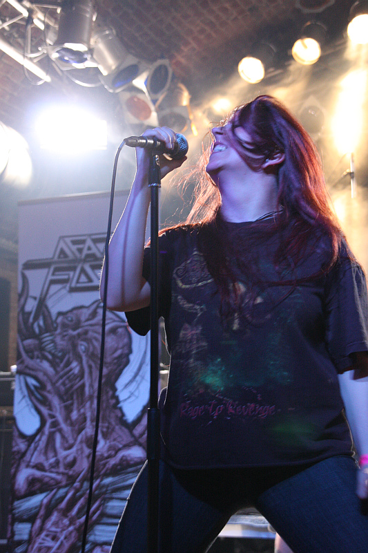 Deren Gitarrist verweilt aber noch unerwartet lange am Merchandise-Stand, was bedeutet, dass ACCU§ER zunächst mal auf dem Plan stehen, weil deren Gitarrist wohl noch etwas anderes an diesem Abend vor hat. Die 2008 reformierten Siegener Urgesteine der deutschen Thrashszene hatten es seit jeher schwer und kamen über das, was man leicht beschönigend Kultstatus nennt, eigentlich nie hinaus. Was die Show an diesem Abend bestätigt. Das Interesse der Zuschauer ist anfangs noch sehr gering, im Laufe des Auftritts gesellen sich aber immer mehr meist ältere Gäste vor die Bühne. Die werden zwar von Sänger Frank Thoms und vor allem vom schwer agilen Basser Frank Kimpel immer wieder zum Mitmachen animiert, so richtig viel los ist aber während des gesamten Auftritts nicht. Der riff- und groovelastige Thrash, der ein wenig an frühere Metallica erinnert, trifft den Geschmack des Publikums nur eingeschränkt, das aber zumindest für die beiden alten Nummern "Who Dominates Who?" und "Symbols Of Hate" mehr als nur Höflichkeitsapplaus spendet.Ganz anders sieht es dann bei DEATHFIST aus, die man im Grunde genommen als Newcomer bezeichnen kann, denn ihr erstes Album "Too Hot To Burn" erschien erst 2010. Gitarrist Markus Wichmann und die überaus charismatische Frontfrau Corinna Becker waren aber vorher schon lange Zeit in einer anderen Band aktiv und durch seine Tätigkeit bei Metal Inquistitor hat Basser Cliff Bubenheim natürlich auch jede Menge Erfahrung.