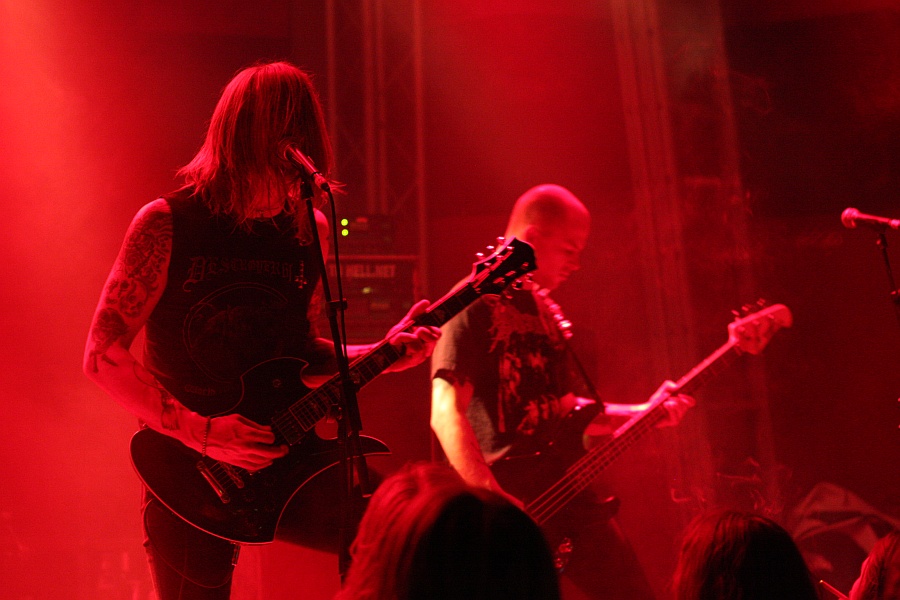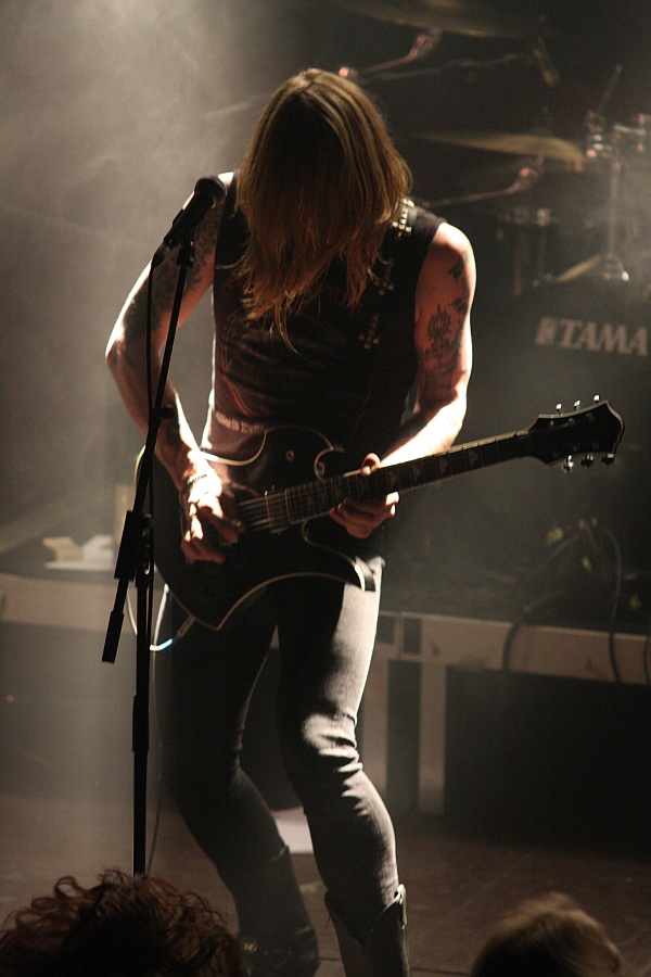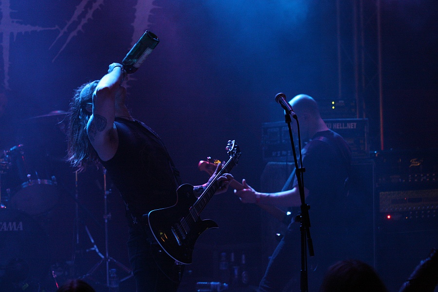 Den Anfang machten also KETZER, die mit ihrem an DESTRÖYER 666 und RAZOR OF OCCAM erinnernden angeschwärztem Thrash der perfekte Einheizer waren. In der halben Stunde, die zur Verfügung stand, prügelte man sich durch alle acht Songs des Debütalbums "Satan's Boundaries Unchained" und das mit einer erstaunlich guten Tightness. Auch die Bühnenshow war durchaus ansehnlich, es wurde gebangt was der Nacken hergab und auch alle Posen saßen einwandfrei. Lediglich Sänger Infernal Destroyer wusste in den gesangsfreien Passagen nicht allzuviel mit sich anzufangen und stand dann oft mit dem Rücken zum Publikum. Allgemein wirkte man im Umgang mit den Fans auch noch ein wenig schüchtern und unnötig zurückhaltend und so gab es auch fast keine Ansagen. Sei's drum, das viehische Geprügel kam jedenfalls sehr gut an und so manche Matte flog jetzt schon dauerhaft. KETZER gehören neben HELLISH CROSSFIRE sicherlich zu den interessantesten neuen Bands in der deutschen Extremmetal-Szene.