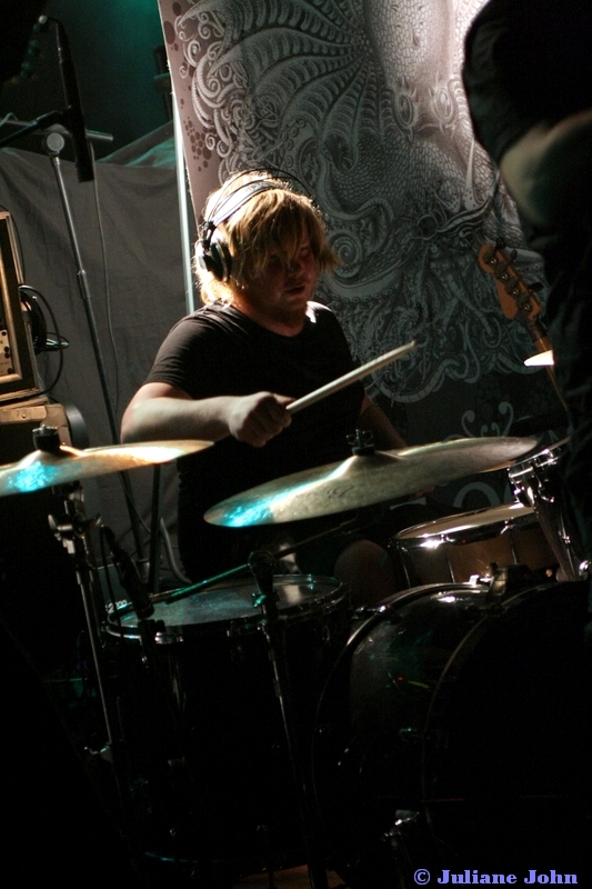 Als THE OCEAN die Bühne erklimmen, steht das Publikum noch in lockerer Formation in der Markthalle – noch nicht alle Besucher haben den Weg in den Innenraum gefunden. Der experimentelle, mit doomigen Postcore-Versatzstücken angereicherte Brutal-Prog läuft dem Publikum bestens rein, was nicht nur an dem exzessiven Gehampel einer der beiden Gitarristen liegt, sondern auch an der Qualität der Songs, die trotz schwer zu folgender roter Fäden und sich langsam ausbreitenden Soundaufschichtungen live sehr gut rüberkommen. Die Band beschränkt sich auf der Bühne auf die klassischen Rock-Instrumente – Violine, Saxophon und Keyboards müssen zuhause bleiben, einige Samples kommen vom Band. Ein gelungener Auftritt, der Appetit auf mehr macht.