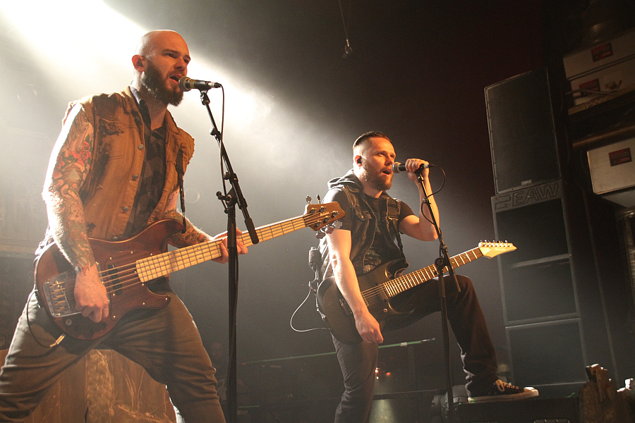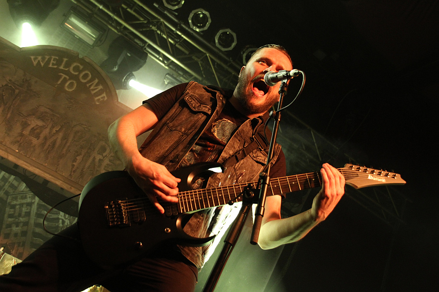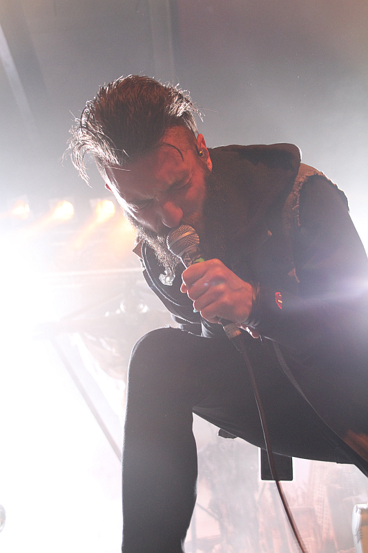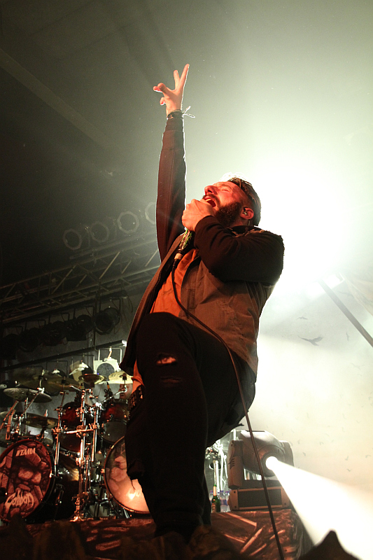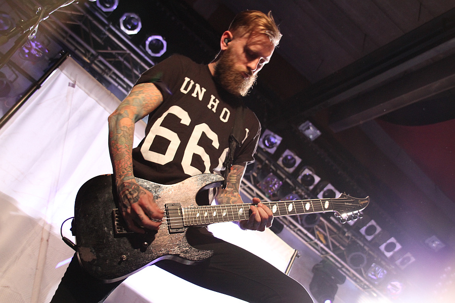Beim Headliner CALIBAN fällt als erstes das spektakuläre Bühnenbild auf, das sich am Artwork des aktuellen Albums "Ghost Empire" orientiert. Vor allem das große, beleuchtete "Welcome To Ghost Empire"-Schild sowie die  düsteren, gekreuzigten Figuren mit Gasmaske stechen ins Auge und sorgen für eine apokalyptische Atmosphäre, die von CO2-Fontänen untermalt wird. Wie auf dem Album steigt die Band mit "King" ein und lässt direkt danach das hymnische "We Are The Many" folgen. Die Verbundenheit mit dem Publikum demonstriert Fronter Andreas Dörner bei dem Song, indem er von der Bühne springt und sich an der Absperrung weit ins Publikum lehnt und Hände abklatscht.Caliban Das Crowdsurfen wird nur von der Security verhindert, die Mühe hat, ihn an seiner Hose festzuhalten. Zurück auf der Bühne brüllt er sich als nächstes bei "Nowhere To Run, No Place To Hide" die Seele aus Leib und agiert dabei mimik- und gestenreich. Weiter geht es mit "Devil's Night" und "Dein R3.ich", bevor man bei "nebeL" den Fuß vom Gaspedal nimmt. Auf Platte wird der Song gemeinsam mit CALLEJONs BastiBasti gesungen und eigentlich hätte man erwarten können, dass er auf die Bühne kommt um den Song mit der Band zu performen, immerhin wohnt er ja nur ein paar Kilometer rheinabwärts in Düsseldorf. Tut er aber nicht und so kommen seine Gesangsbeiträge nur vom Band. Darüberhinaus hat man auch bei den Klargesangspassagen immer mal wieder den Eindruck, als wäre da nicht alles live sondern würde eingespielt. Drauf festlegen würde ich mich aber nicht. Inzwischen hat die Security auch mit Crowdsurfern gut zu tun und das Publikum stellt sich selbst zur Wall Of Death auf. Die Band versorgt die schwitzenden ersten Reihen derweil mit Wasserflaschen. Im weiteren Verlauf konzentrieren sich die Essener auf Songs der beiden aktuellen Scheiben, werfen aber kurz vor Schluss dann noch das 2006er "Nothing Is Forever" ein. Den erwartungsgemäßen Abschluss eines guten, wenn auch nicht überragenden Auftritts mit recht brachialem Sound macht mit "yOUR Song" der große Hit von "Ghost Empire".