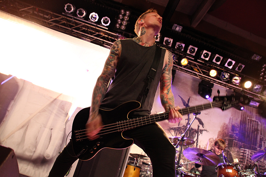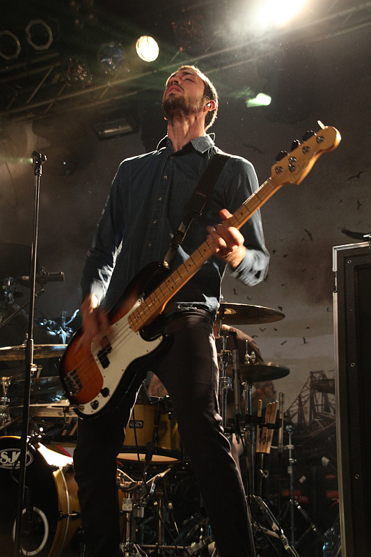 The Devil Wears PradaWas man von THE DEVIL WEARS PRADA nur bedingt behaupten kann. Die reichern ihren christlich angehauchten Metalcore zwar mit dezenten Keyboards, bedient von einem Kerlchen mit Nerd-Optik, an, trotzdem wirkt das Songmaterial insgesamt ziemlich 08/15. Erschwerend kommt der ziemlich fiese, unnatürliche Drumsound hinzu. Zwar ist bei keiner der fünf Bands an diesem Abend der Sound richtig gut, aber hier stört es am meisten. In Sachen Bühnenaction fällt vor allem der reichlich hyperaktiv agierende Frontmann auf, während der lange Lulatsch am Bass sein Instrument mit einer gewissen Stoik bearbeitet. Als einzige Band des Abends fahren THE DEVIL WEARS PRADA übrigens einen Langhaarigen auf. Das tut zwar im Grunde genommen nichts zur Sache, aber wenn man sich angesichts der Livedarbietung langweilt, achtet man dann eben auf solche Nebensächlichkeiten.