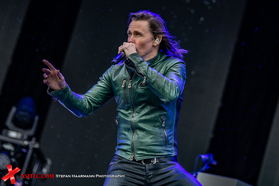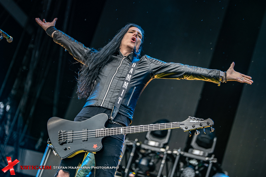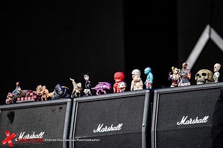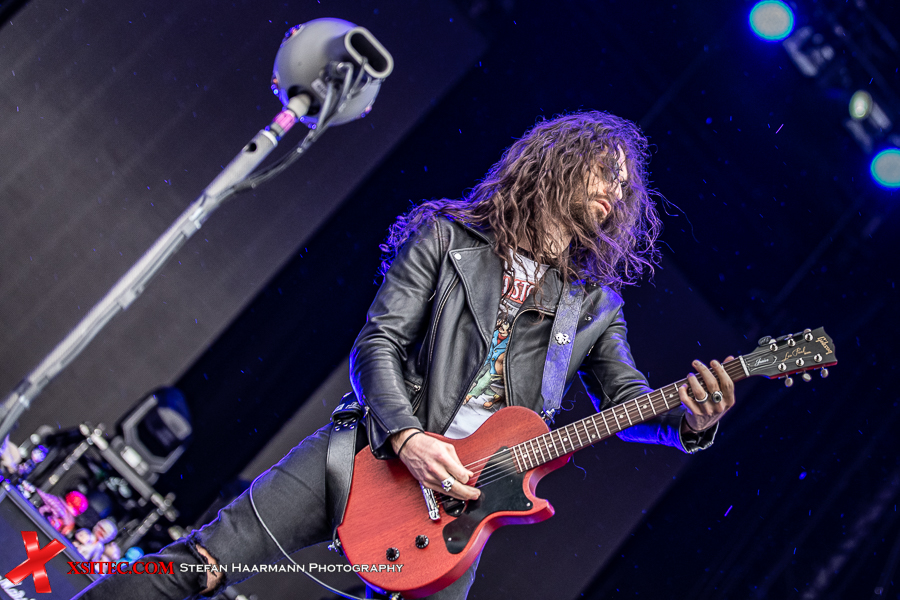 Für mich startet das Festival mit GUNS´N´ROSES Urgestein SLASH, der in Kollaboration mit dem formidablen MYLES KENNEDY bei einsetzendem Regen auf der VOLCANO-STAGE Kostproben seines Könnens gibt. Der Name der Bühne geht übrigens zurück auf die den Ring umgebende Landschaft und ist eine Hommage an die Vulkaneifel, die auch heute noch aktive Vulkane zu bieten hat. Neben der wie immer beeindruckenden und für Slash üblichen Marshall-Wall fällt der Blick auf die Sammlung verschiedener Avengers-Figuren, die der Gitarrenvirtuose wohl als Glücksbringer auf den Stacks drapiert hat. Kind geblieben, der Gute.