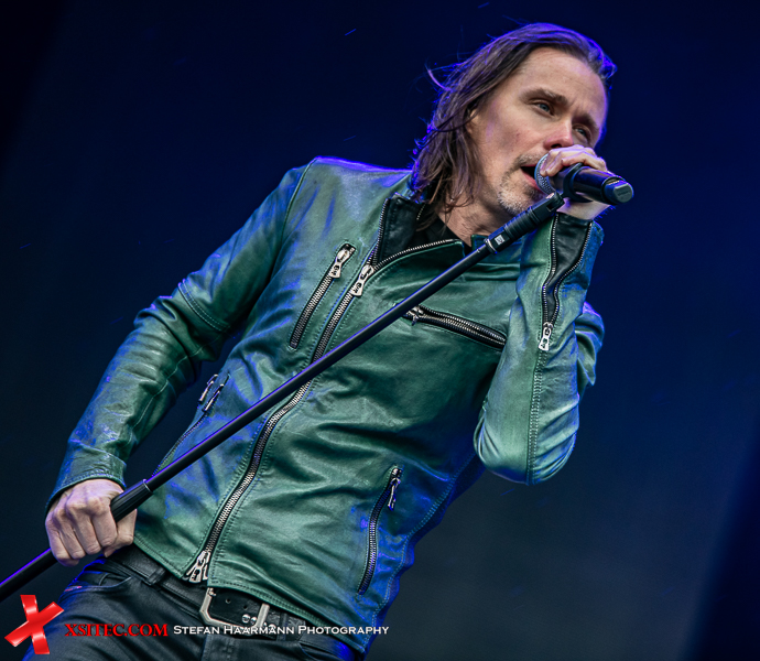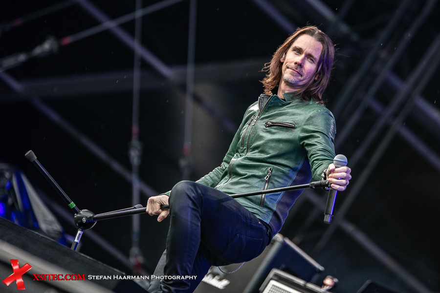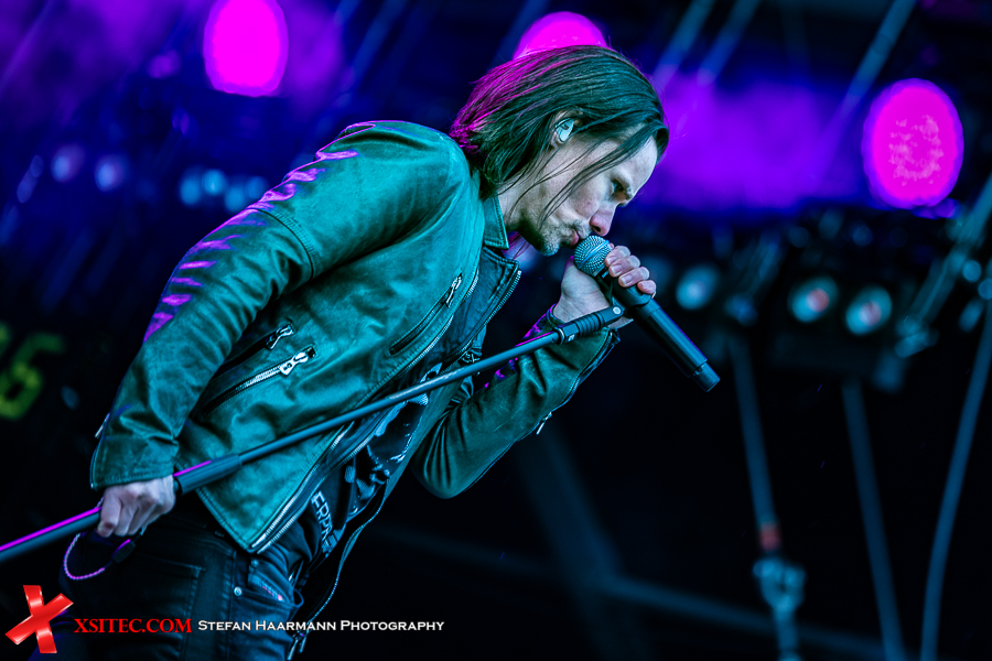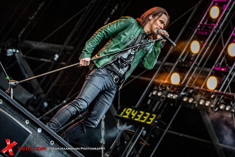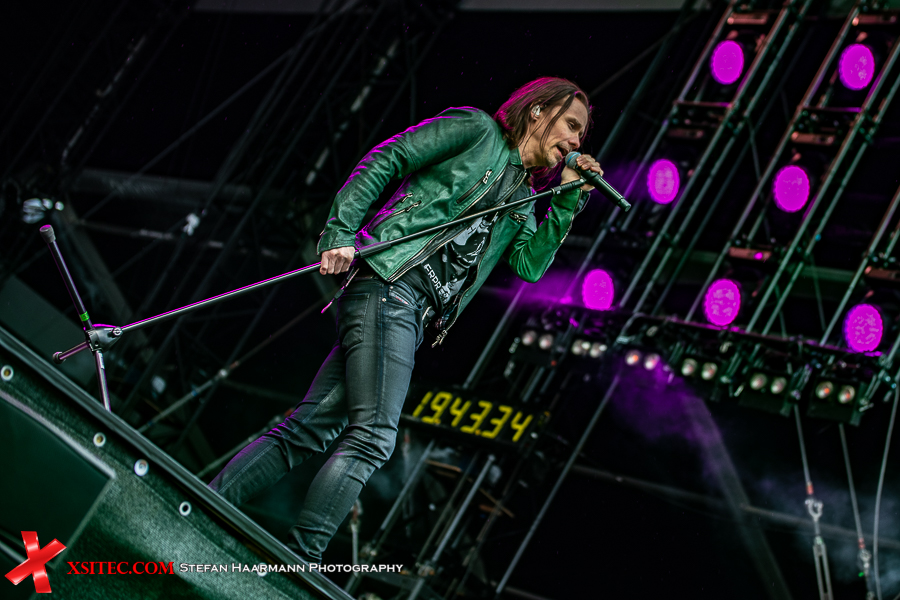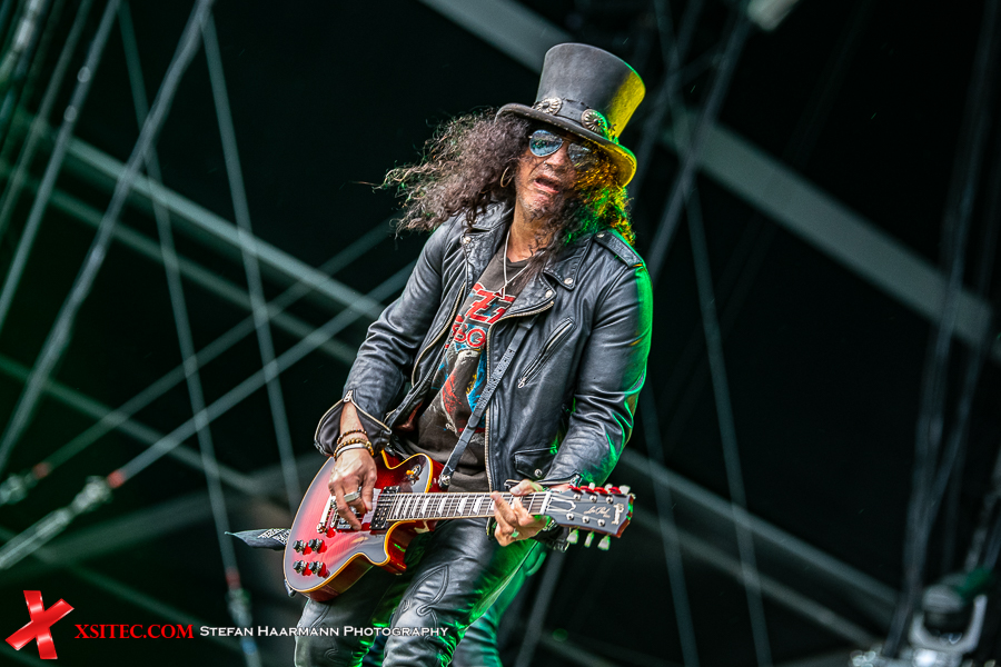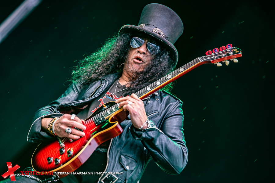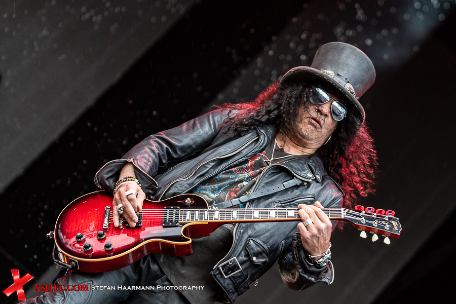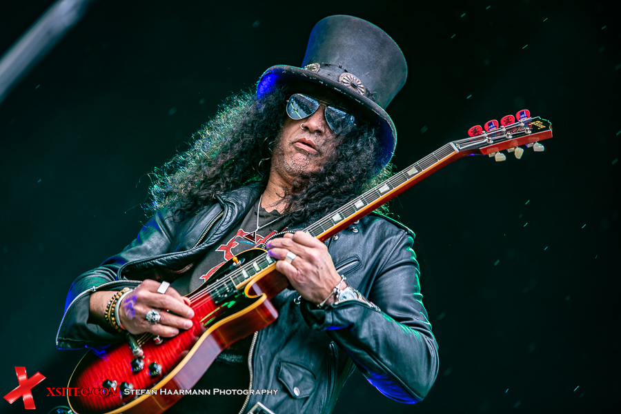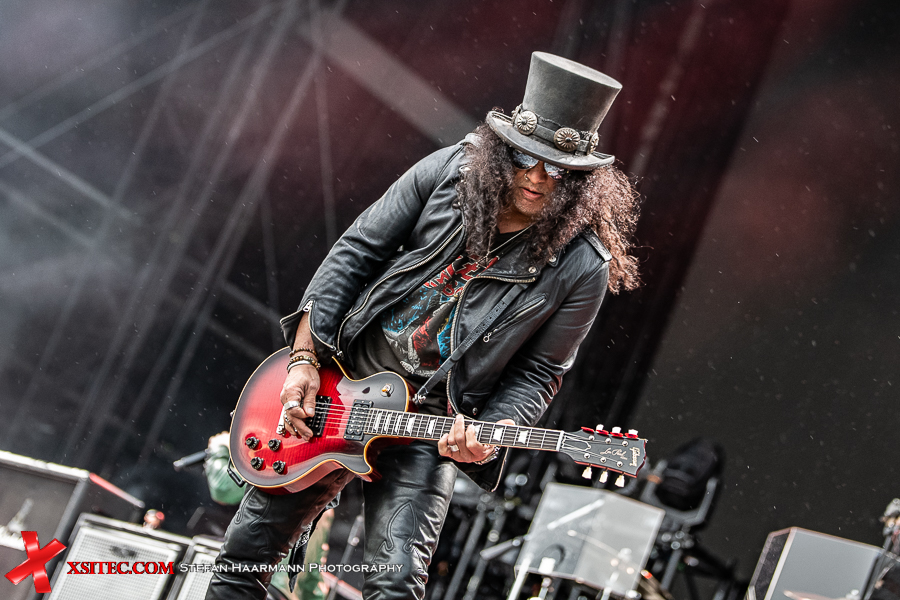 Nach dem Intro „Ray´s Goodbye“ vom Band startet das reguläre Set mit „The Call Of The Wild“ standesgemäß rockig. Während der Regen stärker wird, kommt bei „Halo“ bereits richtig Stimmung auf, zumal Slash immer wieder an den Bühnenrand kommt und sich während seiner Soli einfach nass regnen lässt. Der Mann weiß, was er seinen Fans schuldig ist und „Standing In The Sun“ an diesem Tag nur sporadisch Wirklichkeit wird. Typisches Ringwetter halt. „Back From Cali“ ist der erste, reine Slash Titel im Set, „My Antidote“ und „Serve You Right“ beweisen, wie gut die beiden Hauptakteure aufgelegt sind. SLASH brilliert an seiner Gibson, Kennedy beweist sich in sympathischer Art und Weise als Frontmann par excellence und hat das Publikum vor der Hauptbühne komplett auf seiner Seite.