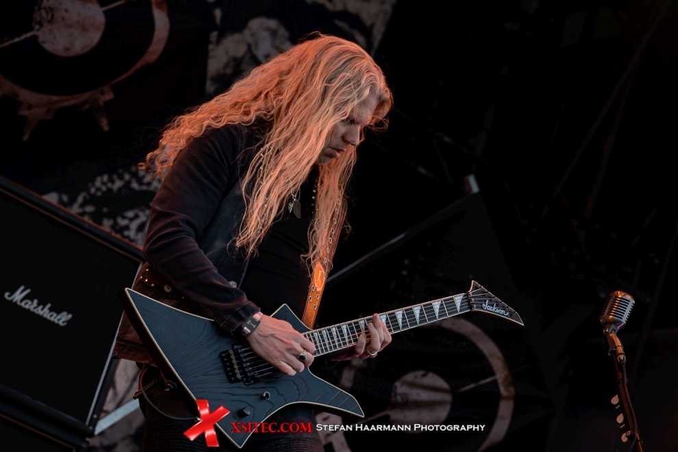 Nach dieser Überdosis Testosteron wirkt der Kontrast, den Alissa White-Gluz mit ARCH ENEMY setzt, geradezu surreal, zumal die Frontlady der schwedischen Erzfeinde alles andere als Kuschelrock zu bieten hat. Neben den virtuosen Gitarrenparts, die Michael Amott und Jeff Loomis ins Scheinwerferlicht rücken, dominiert Alissa die Szenerie mit gutturalem Gesang, der nicht ansatzweise hinter der zierlichen Schönheit zu vermuten wäre. Das Infield vor der MANDORA ist rappel voll, aus allen Richtungen strömen weitere Fans hinzu, die sich diese Sternstunde nicht entgehen lassen wollen. Neu ist das auf dem Kopf stehende Pentagramm über dem Schlagzeug, dass als Eyecatcher seinen Zweck erfüllt und einen perfekten Hintergrund abgibt. Kurz nach Veröffentlichung einer Preview kam dann eine E-Mail des ARCH ENEMY Managements mit der Bitte, das folgende Foto verwenden zu dürfen. Da fühlt man sich dann doch geehrt.