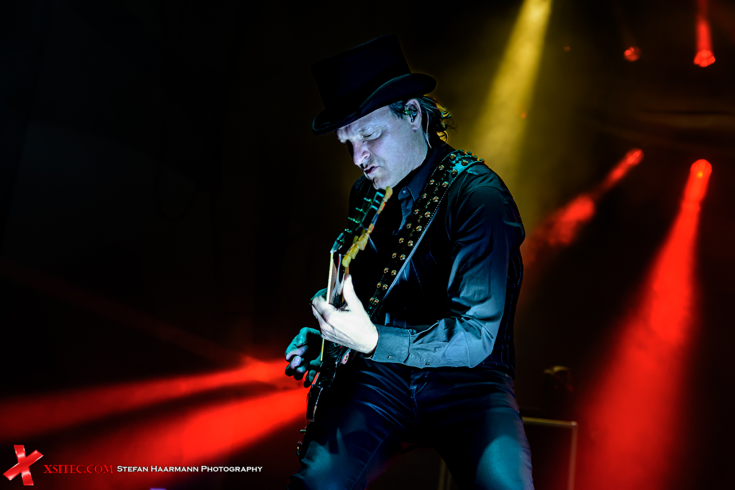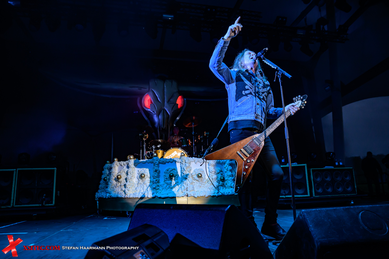 Der kräftige Regenguss, der etwa zur Hälfte der RIOT V-Show heruntergeht, kann die Vorfreude auf den Headliner des Tages indessen nicht trüben. Während fleißige Helfer die Bühne für D-A-D herrichten, versuchen die Zuschauer, die Zeit bis zum Gig der kultigen Dänen zu überbrücken und erfreuen sich am Test der Lichtanlage, die bereits vor der Show die Szenerie prächtig erleuchtet. DYSNEYLAND AFTER DARK, so der ursprüngliche Name der Band, firmieren seit der Androhung einer Klage der Walt Disney Company unter dem Kürzel D-A-D und starten mit „The Road Below Me“, während der überdimensionale Bullenschädel im Hintergrund sich in allen Farbschattierungen zeigt und des Öfteren auch mit feuerroten Augen blinzelt. Das Wetter spielt nun glücklicherweise auch mit, so dass die Band ihr gesamtes Potential auf die Bühne bringen kann. Star des Abend ist Bassmann Stig Pedersen, der die tiefen Töne seinen Zweisaitern entlockt, die allesamt handgefertigte Unikate sind und für zusätzliche Showeffekte sorgen. D-A-D beenden die fantastische Performance mit „Sleeping My Day Away“, „Jihad“ und „It´s After Dark“, bevor das brodelnde Amphitheater die Dänen mit anhaltenden Ovationen in die Nacht verabschiedet.
