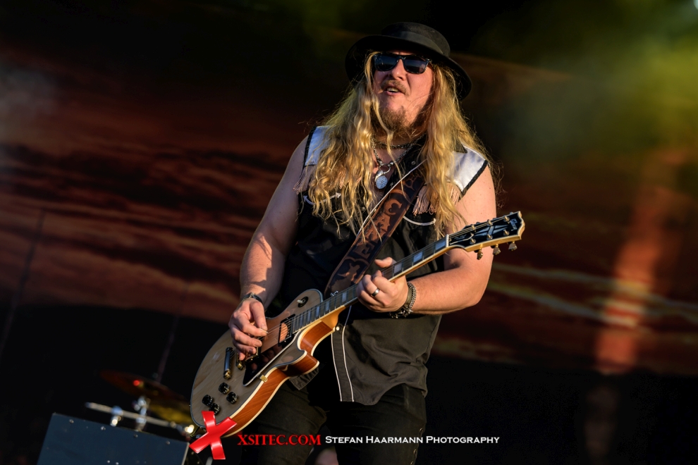 Aber auch KORPIKLAANI lassen sich in Sachen Partystimmung nicht lumpen und heizen den Rockharzern mächtig ein. Neben „Beer Beer“ gibt es reichlich „Vodka“, Getränke, die nach eigener Aussage der Band solange genossen werden, bis nichts mehr geht. Auch eine Lebensphilosophie. Vor der Bühne wird im Schein der untergehen Sonne getanzt und gefeiert, dass es eine wahre Pracht ist und nach einer Stunde Spielzeit sind sich alle einig, dass die Finnen hier prächtig abgeliefert haben. Warum Joel O´Keeffe es sich nicht nehmen lässt, bei jeder Show eine Bierdose auf seinem Schädel zu zertrümmern, bleibt wohl ein Geheimnis der PR-Abteilung der Australier AIRBOURNE. Die Fans freut es, zumal der Gitarrist auf den Schultern eines Security-Mitarbeiters das Procedere inmitten der Fans durchzieht.