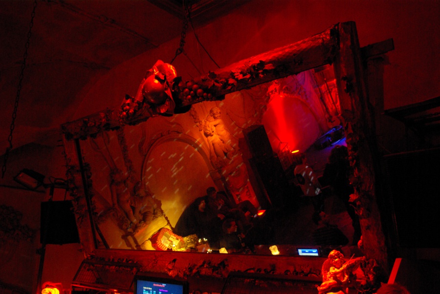Lichtreflexe einer Spiegelkugel wie Sterne huschen. Ein Kronleuchter verströmt schwache Helligkeit und ein riesiger, von Weinreben umrankter Spiegel über der Bar reflektiert die in roten Schummer getauchte Grotte. Gemütlich ist es hier und entsprechend willkommen sind den gerade einmal fünfzig Gästen die Barhocker und Sofas, die den kleinen Konzertraum umgeben. Dies führt aber leider auch dazu, dass die Fläche direkt vor der kleinen Bühne mehr oder weniger leer bleibt.