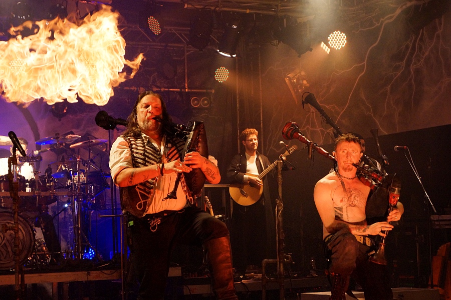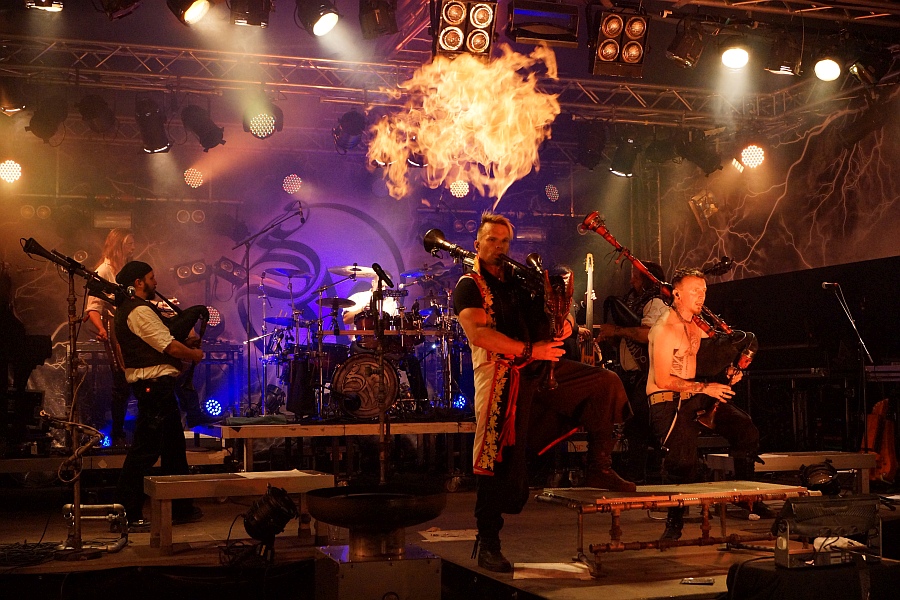 Das Motto „Je später der Abend, desto heißer die Show“ ist für die Jungs von SALTATIO MORTIS Programm, denn die Feuerkanonen, die entlang der Bühne positioniert sind, arbeiten scheinbar am Anschlag und grillen die eine oder andere Fleischmütze in den ersten Reihen. Die Illumination der Bühne wirkt durch die permanenten Eruptionen feuriger Gasbälle mystisch-fantastisch. Alea der Bescheidene, Frontmann und Dudelsack-spielender Derwisch, ist in Hochform und feuert das begeistert mitgehende Publikum ein ums andere Mal zum Mitsingen und -tanzen auf.
