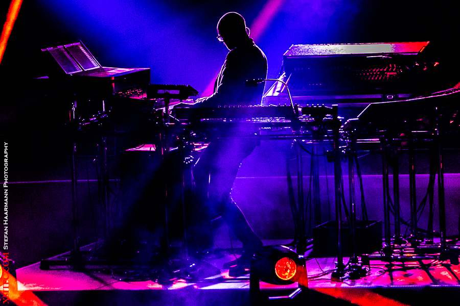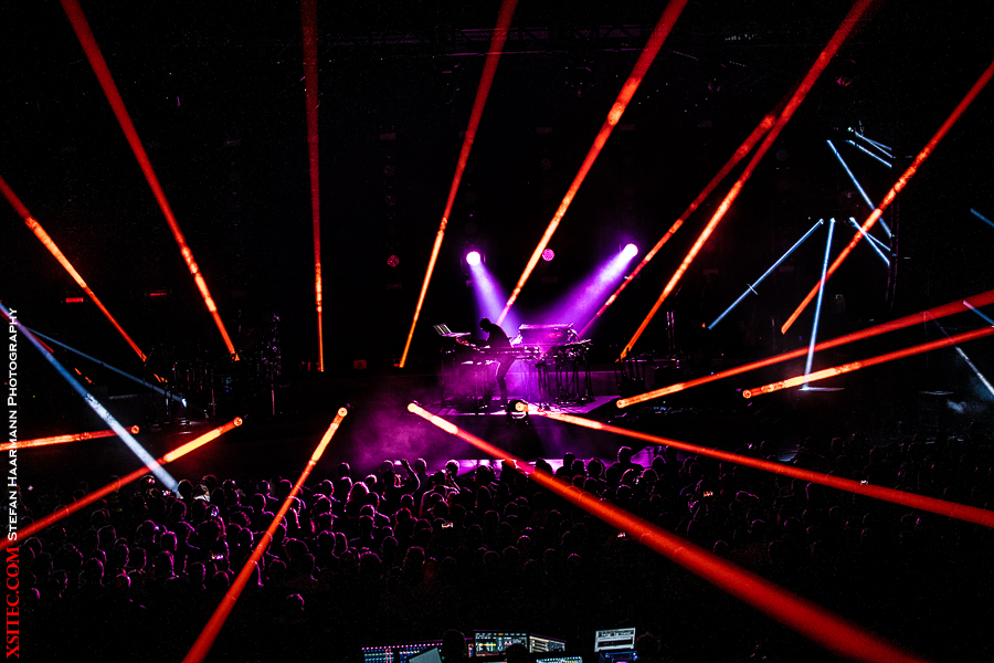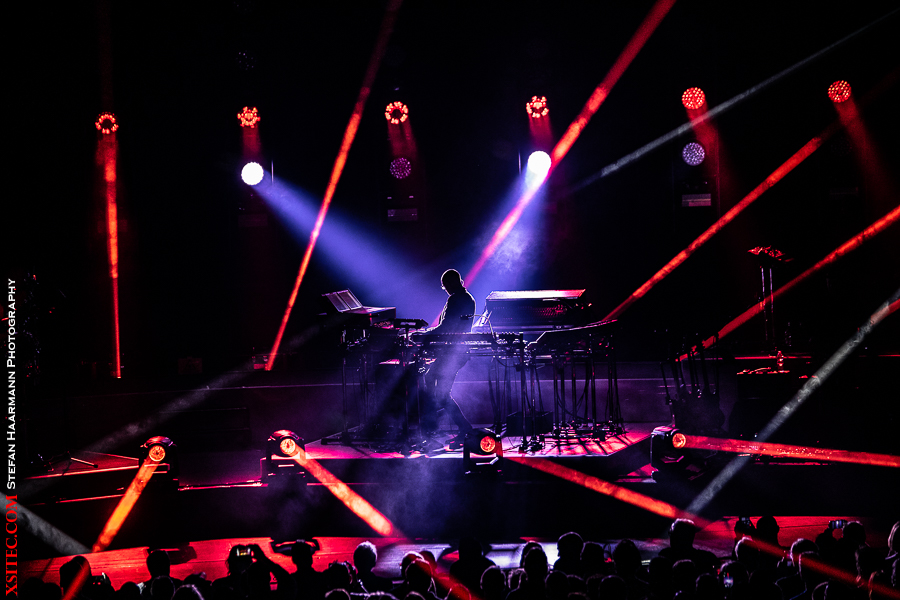 Pünktlich um 20.00 Uhr geht das Licht der Jahrhunderthalle aus und zu wummernden Bässen zucken Lichtblitze durch´s weite Rund, die die Location in ein faszinierendes Lichtspiel tauchen. Dass die Musiker bereits auf ihren Plätzen zu ihren Instrumenten gegriffen haben, kann man zunächst nur ahnen, da die Lichteffekte anfangs keine klare Fokussierung der Augen zulassen. Erst mit der Zeit lassen sich die Musiker auf ihren Podesten ausmachen. Christopher von Deylen, dessen beeindruckendes Keyboard-Arrangement gefühlte 20 m2 Bühne einnimmt, bearbeitet in schwarzem Sakko die Tasten.