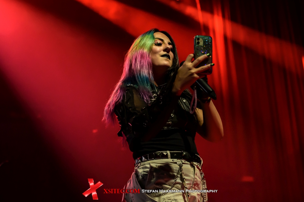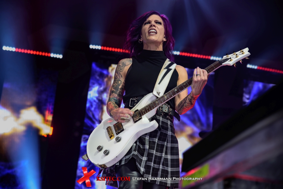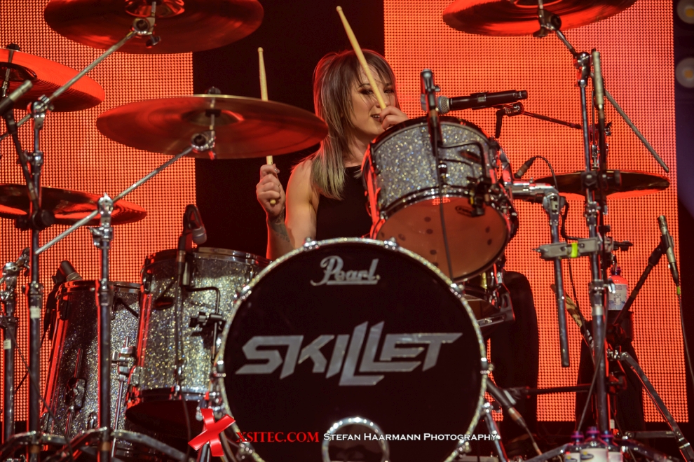 Dann aber ist es Zeit für den Headliner aus Memphis. Waren die beiden Einheizer bereits energiegeladen und voller Elan, kommen SKILLET allerdings im Vergleich wie ein Hurrikan aus der Garderobe. Nach dem Intro zu „Feel Invincible“ entfacht die Band um John Cooper und seine Ehefrau Korey ein regelrechtes Gewitter und hämmert den Song vom 2018er Album „Unleashed“ mit unglaublicher Vehemenz in die Menge. Motiviert bis in die Haarspitzen zeigen SKILLET, warum sie seit der Gründung im Jahr 1996 zu den erfolgreichsten Rockbands der USA zählen. Cooper, der im Laufe des Konzerts einräumt, dass die „Fans in Deutschland härter rocken als in den Staaten“, freut sich riesig über die Resonanz des Publikums, das begeistert mitgeht. Korey Cooper springt wie ein Derwisch über die Bühne und scheint komplett losgelöst von den anderen in ihrer eigenen Welt unterwegs zu sein. Hier merkt man deutlich, dass sich trotz der Rastlosigkeit der Band keine Routine in Form von Stillstand breit gemacht hat. Das permanente „auf Tour sein“ ist die Basis für ein blindes Verständnis, da jeder der Akteure zu jedem Zeitpunkt des Gigs weiß, was seine Bandkollegen als nächstes unternehmen werden.